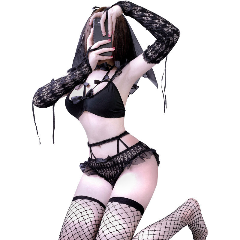 Lencería Uniforme Tentación Ahuecar Las Mangas Del Pecho Velo De Encaje