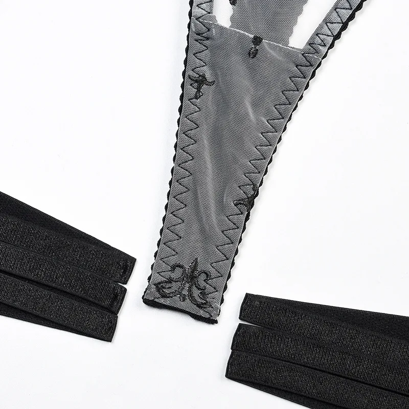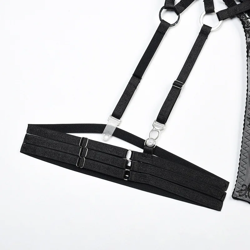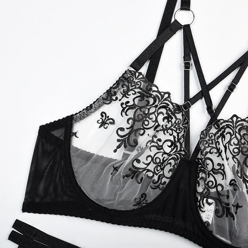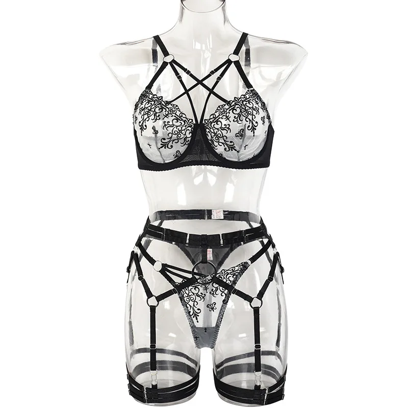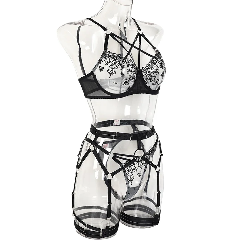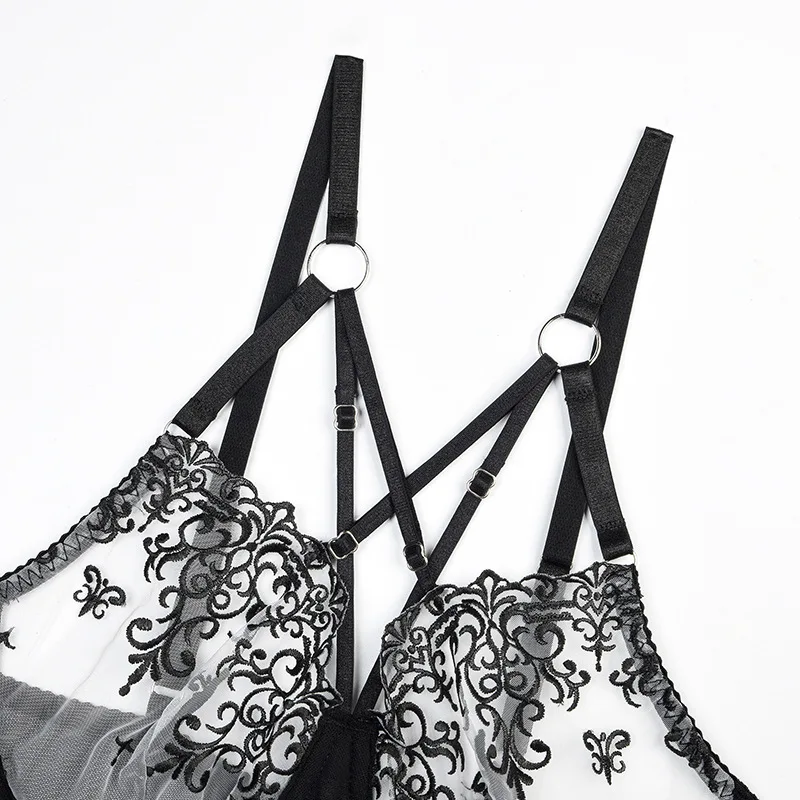 Fancy Lingerie Sujetador cruzado Ropa interior de encaje transparente floral 4 piezas Hada sensual Íntimo sin censura y conjuntos exóticos