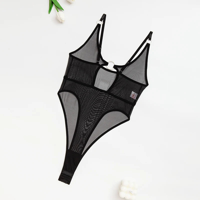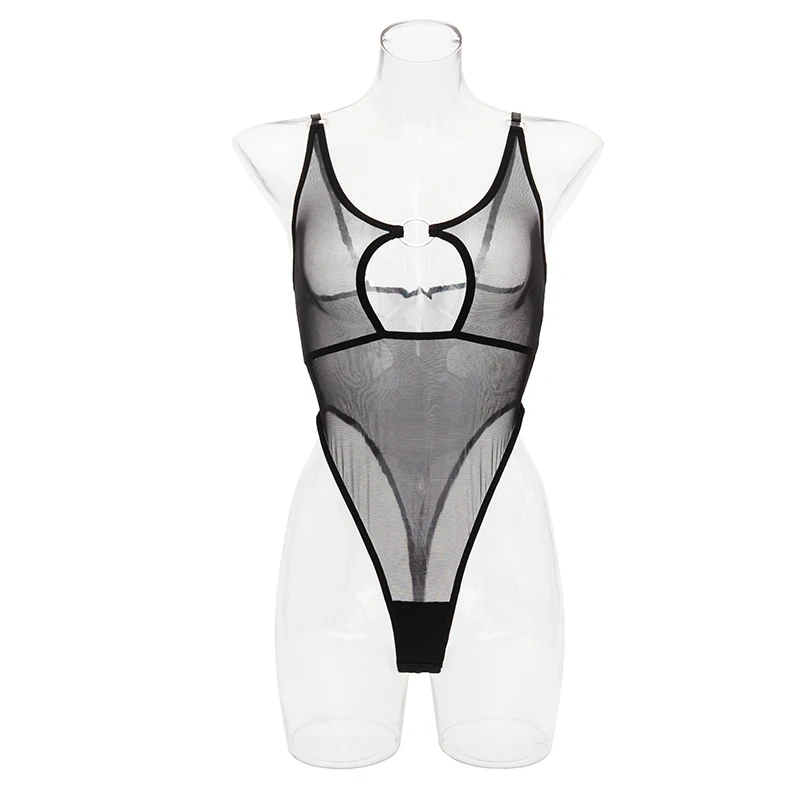 Body de encaje con anillo, cuerpo hueco de corte alto, Tops sensuales sin costuras, malla transparente de una pieza, ajuste ajustado sin entrepierna