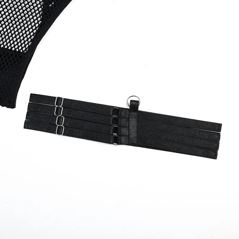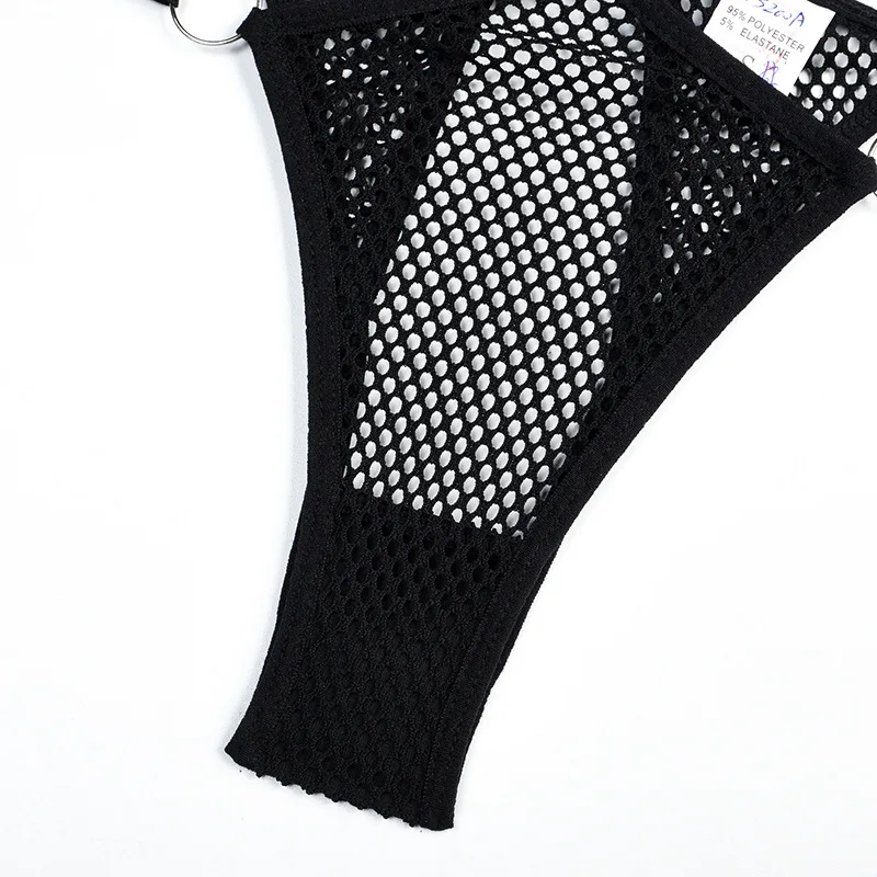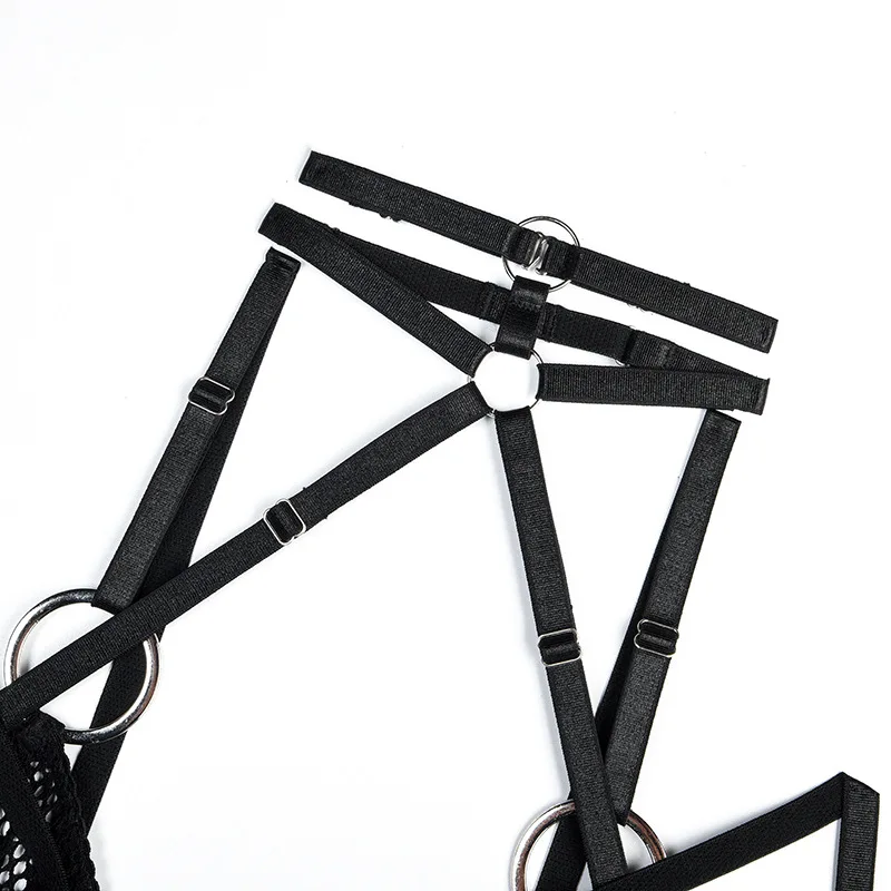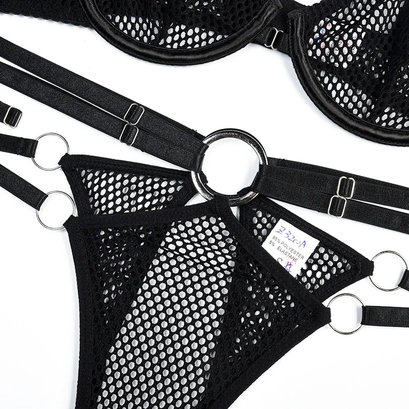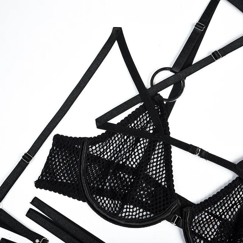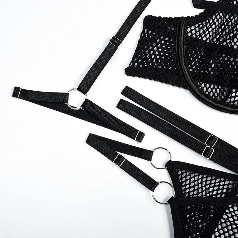 Lencería de malla Conjuntos sensuales sin entrepierna Ropa interior transparente para mujer Vídeo sin censura Negro Sexy Íntimo 4 piezas