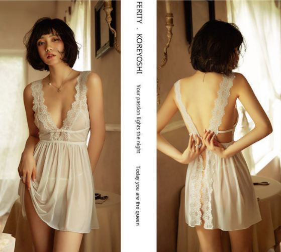 Ruoruo Primavera Verano Deep V Plunge Sexy malla transparente seducción encaje fino Split Mood camisón ropa de hogar