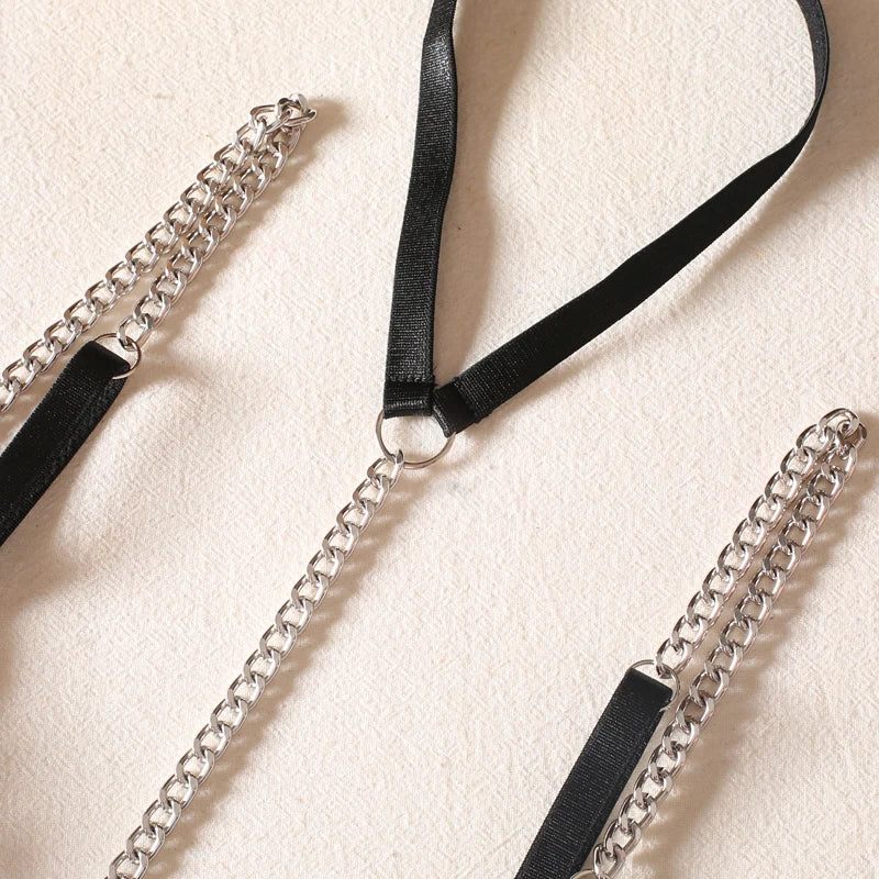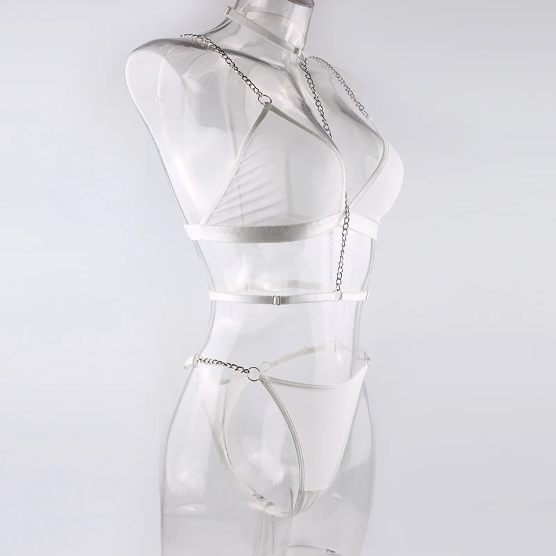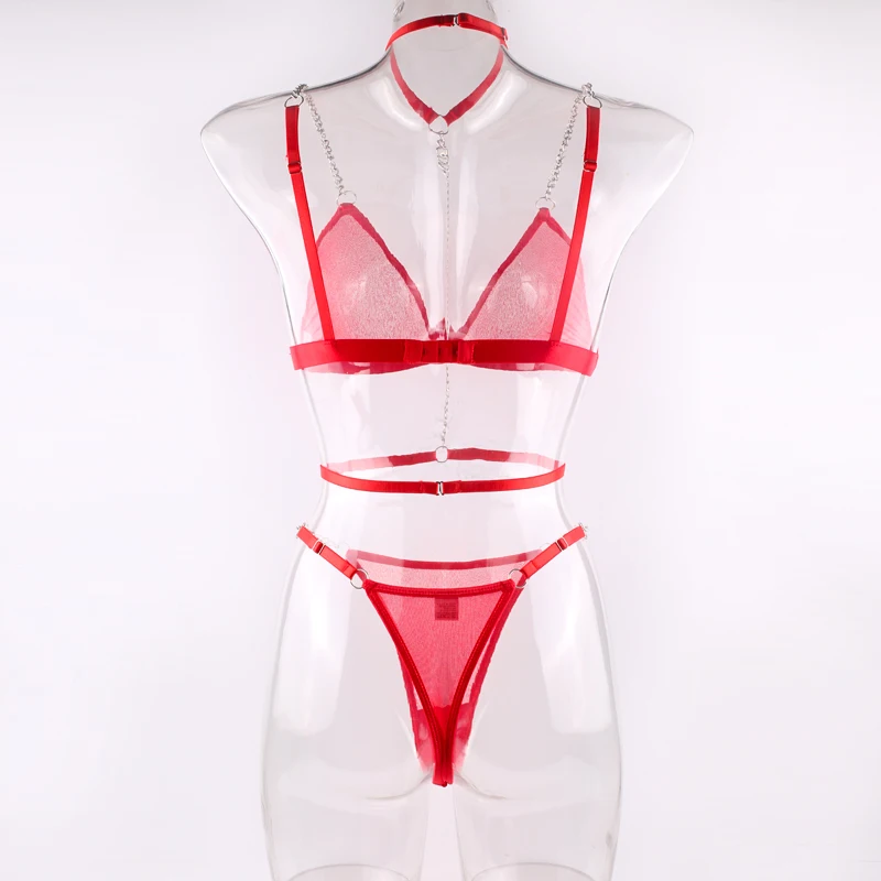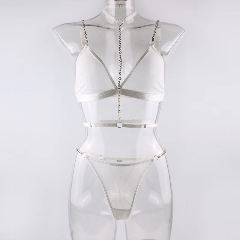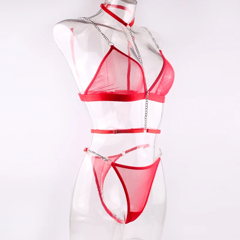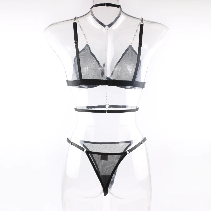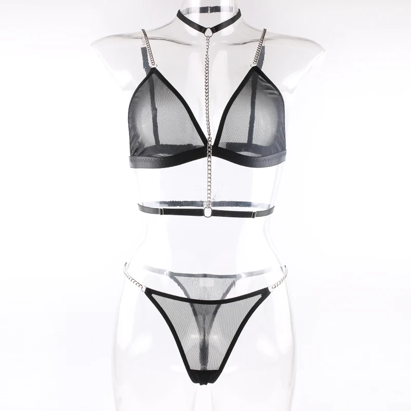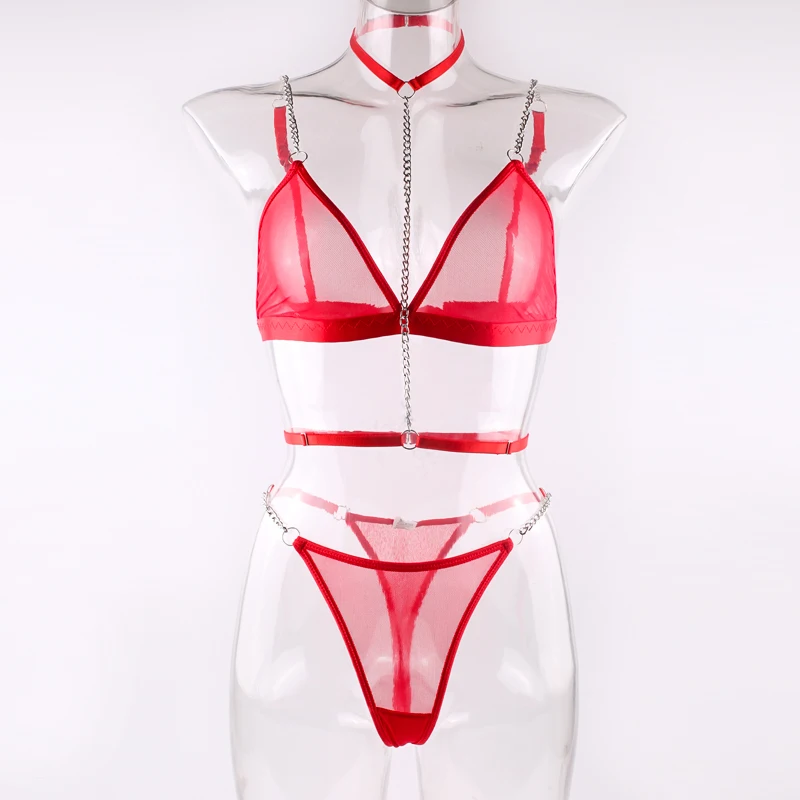 Lencería sensual, ropa interior de tul sin censura con cadena, ligas con cuello Halter, disfraces transparentes de encaje