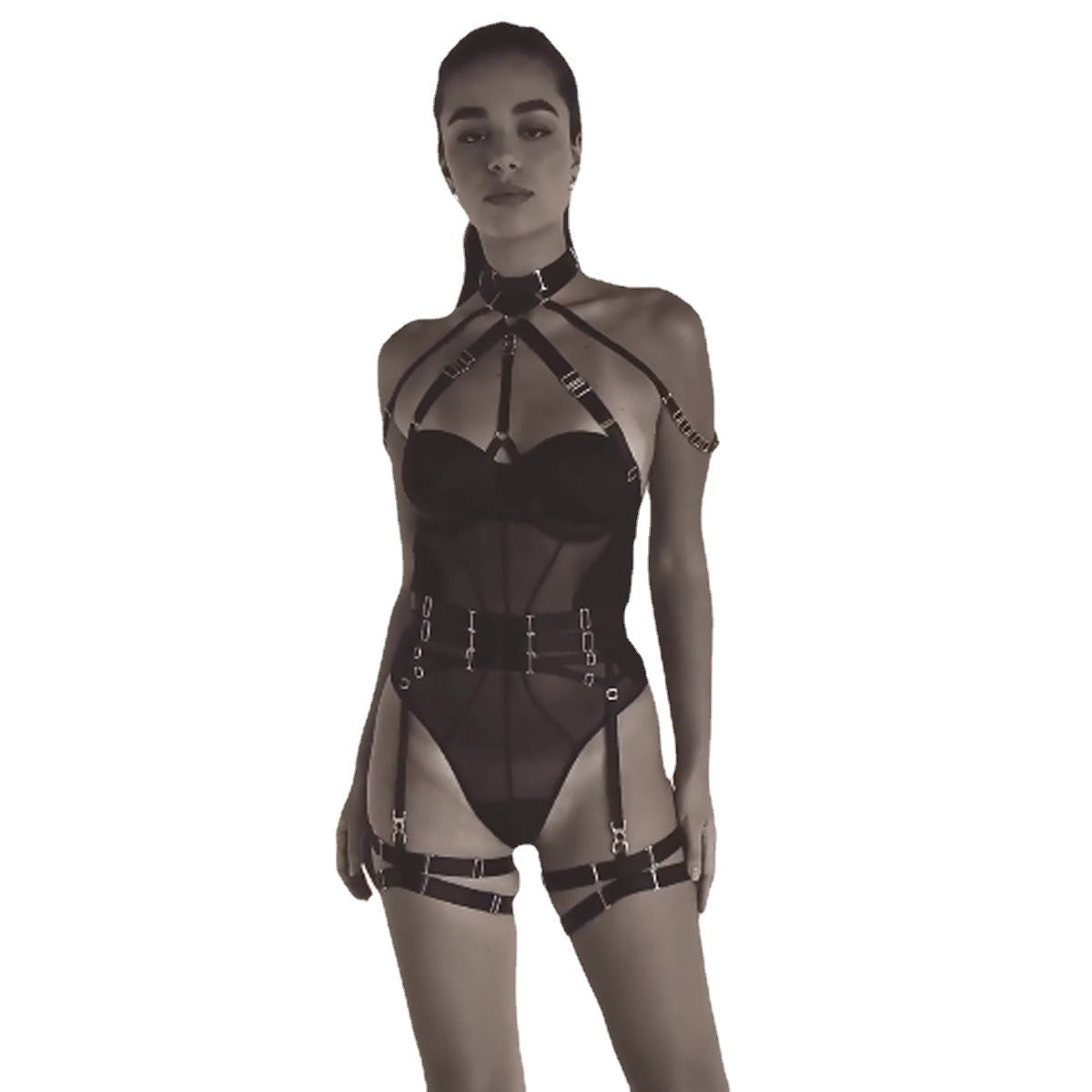 Mono sexy con correa de malla y costura compleja, anillo para pierna con cabestrillo para cuello y artesanía pesada