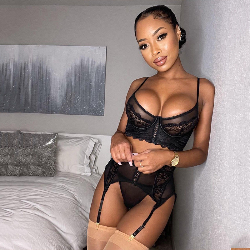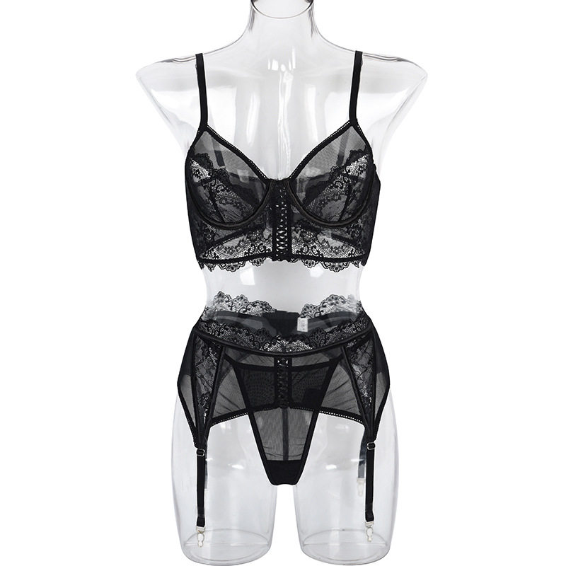 Conjunto de tres piezas de lencería con tirantes y costuras de pestañas de encaje para mujer