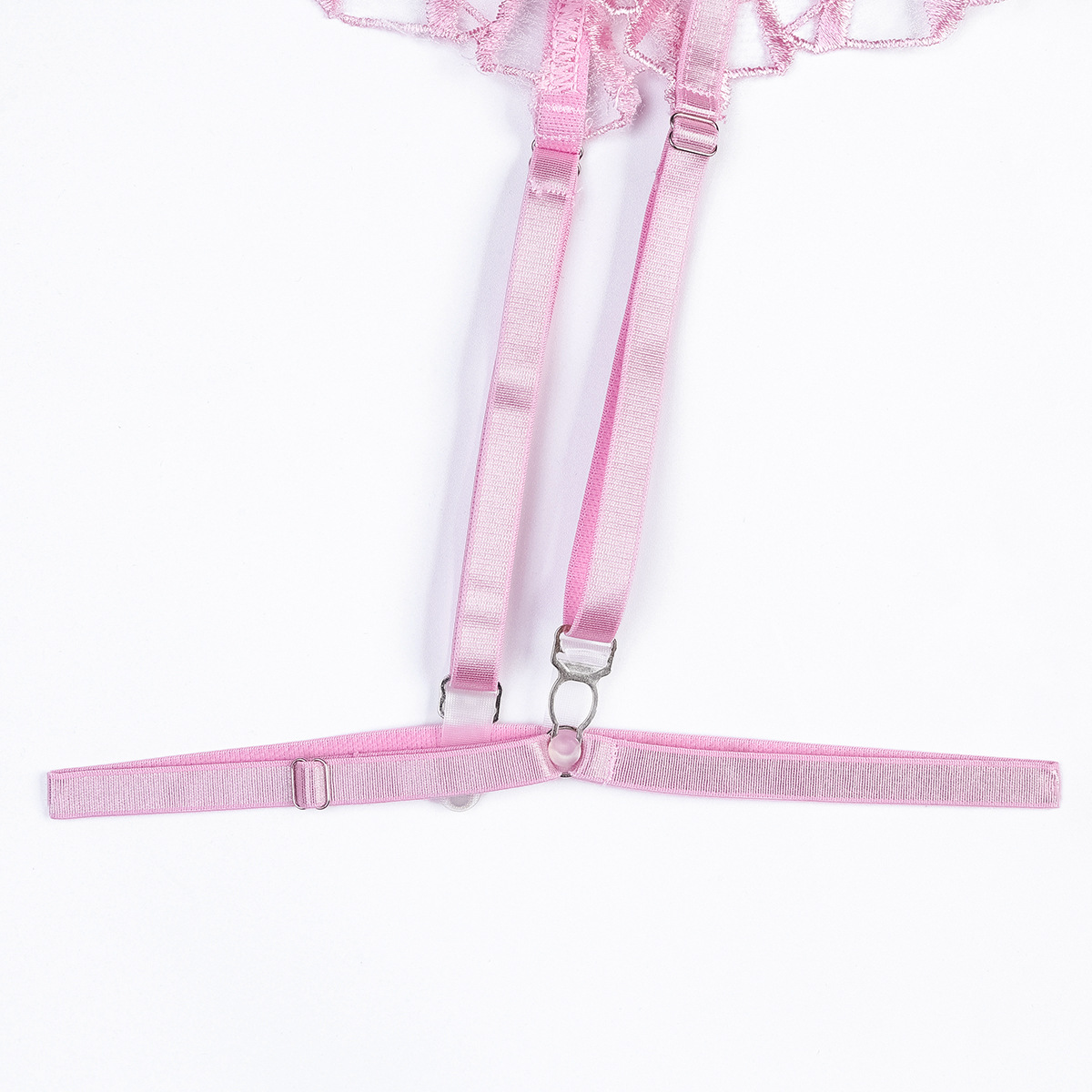 Ensemble trois pièces de sous-vêtements Sexy de haute qualité, broderie asymétrique irrégulière rose brodée sur la poitrine, Patch papillon ajouré