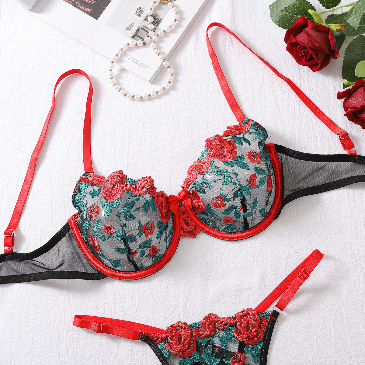 Ensemble deux pièces Sexy avec broderie florale contrastée, sous-vêtements transparents