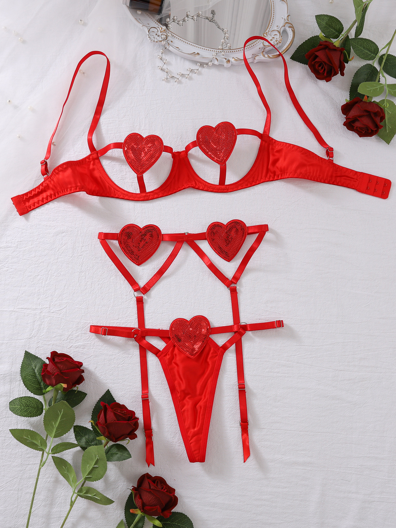 Sous-vêtements sexy Sequ Love brodé Pure Want, ajouré, anneau en acier découpé, ensemble trois pièces Sexy