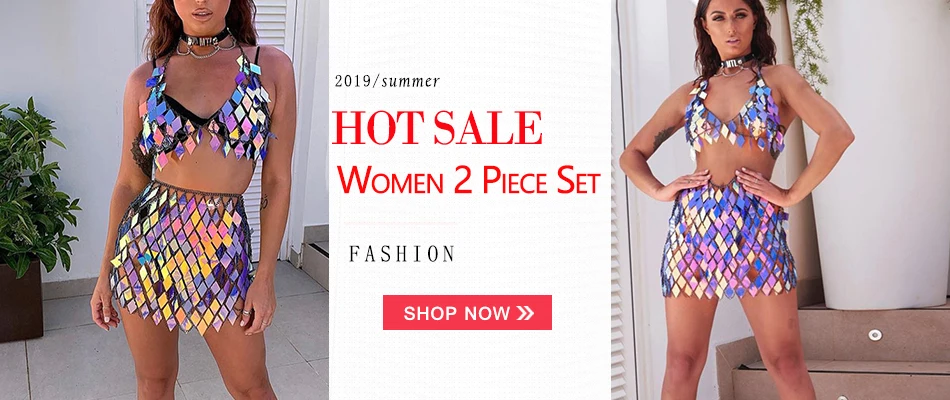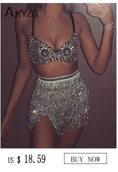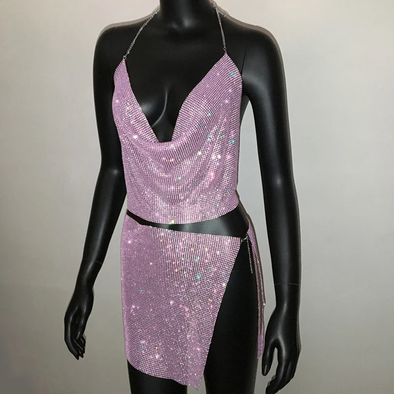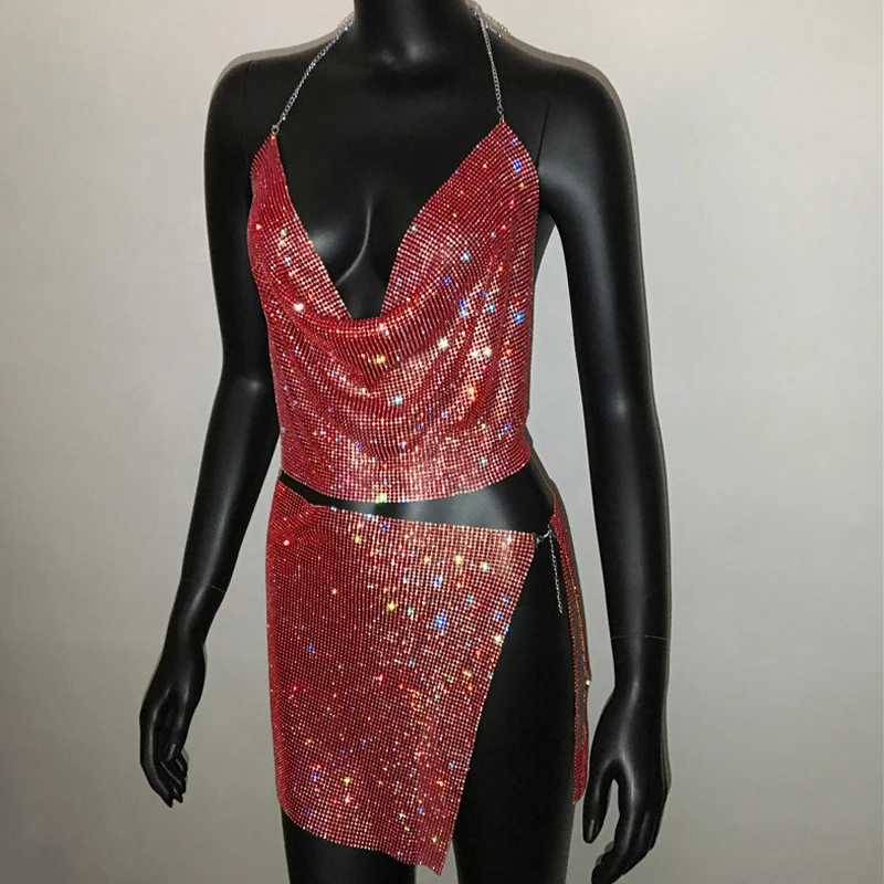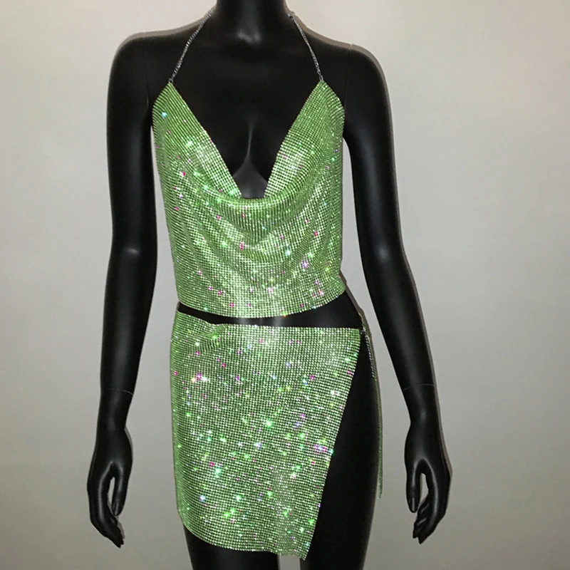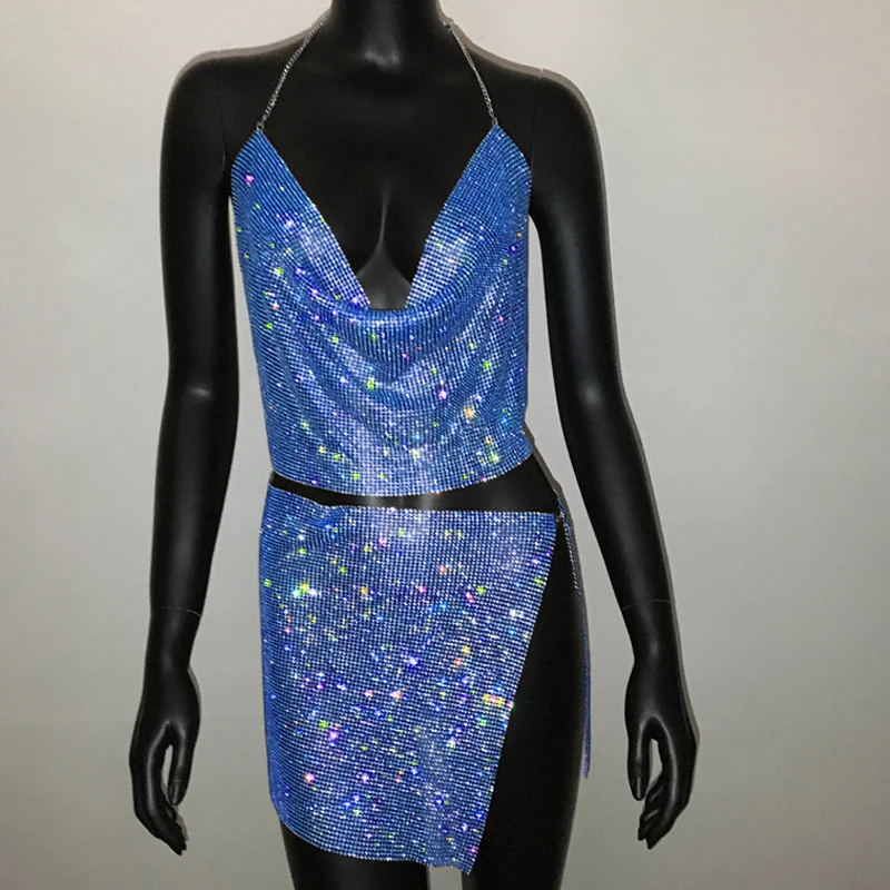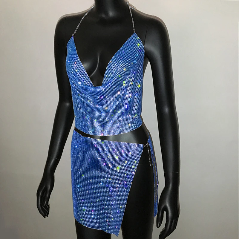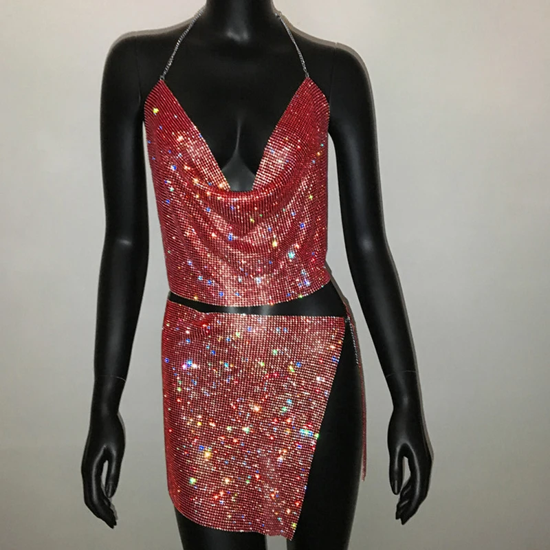 AKYZO Women Sparkly Rhinestone Sexy Two Piece Set 2023 New Low Cut Sleeveless Halter Backless Party Top Split Empire Mini Skirt