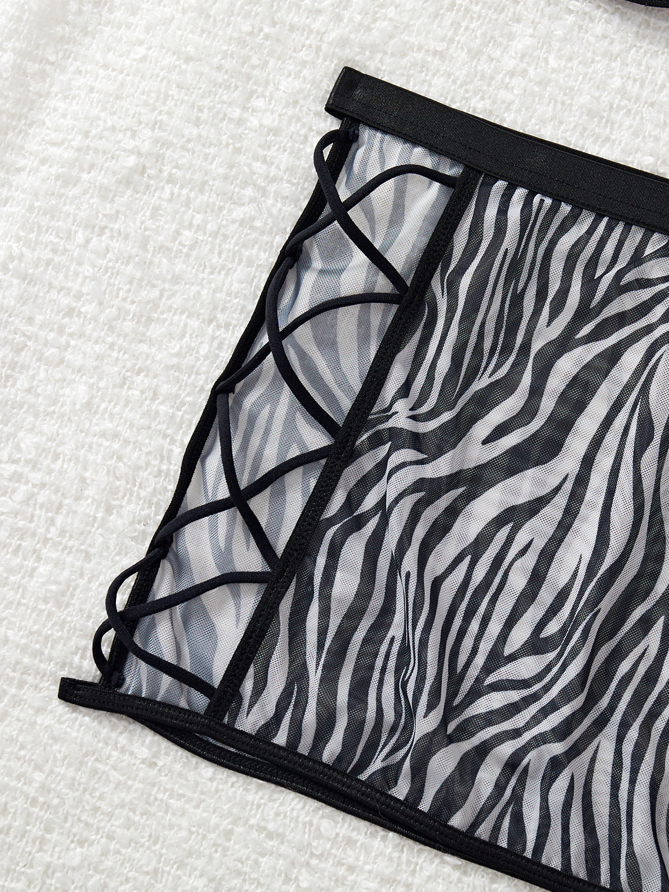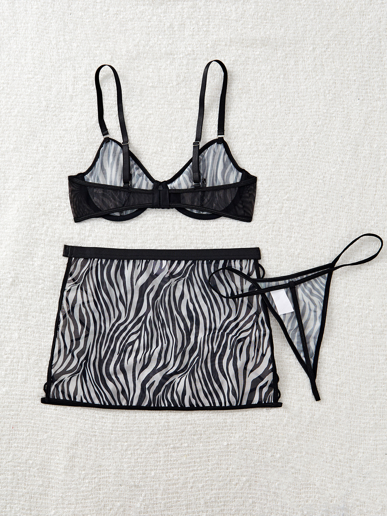 Autumn Bra Underwear Push up Zebra Pattern Mesh A line Skirt Leak Detection Sexy Three Piece Sets