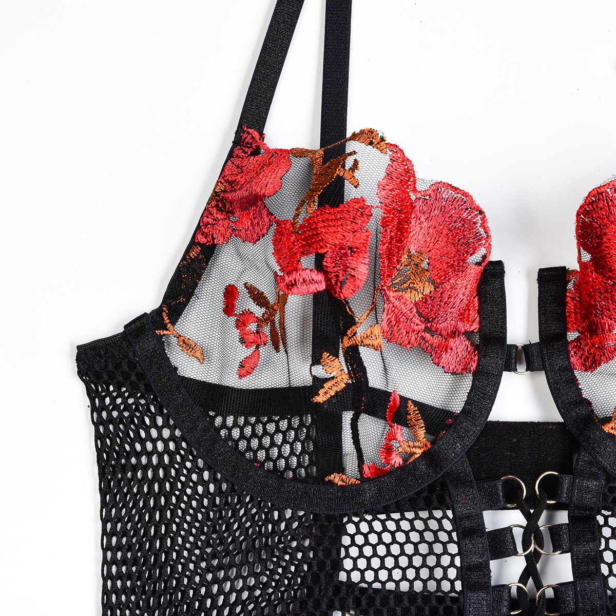 Best Women Clothes Sexy Lingerie Embroidered Floral Lace up Cross Hollow Out Cutout Mesh Four Piece Set