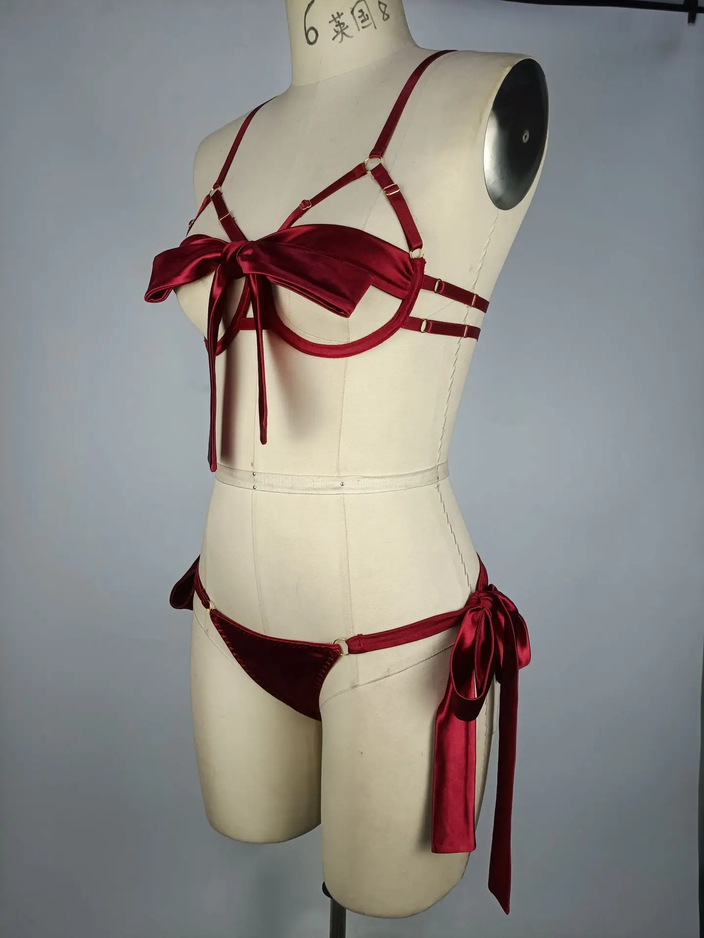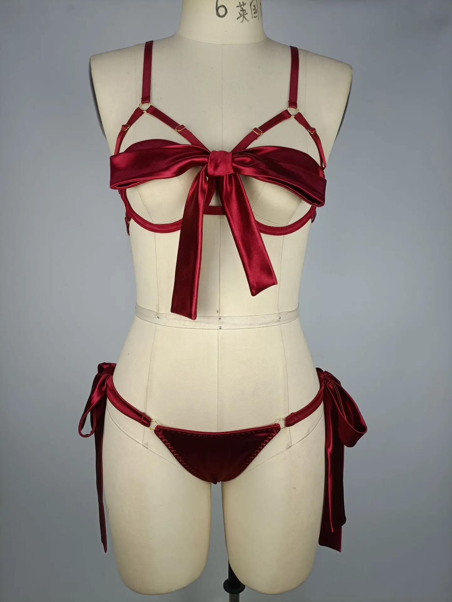Christmas Silk Lingerie Desire Hot Girl Hollow Lace Up Female Costumes Burgundy Fantasy Well-Looking Underwear