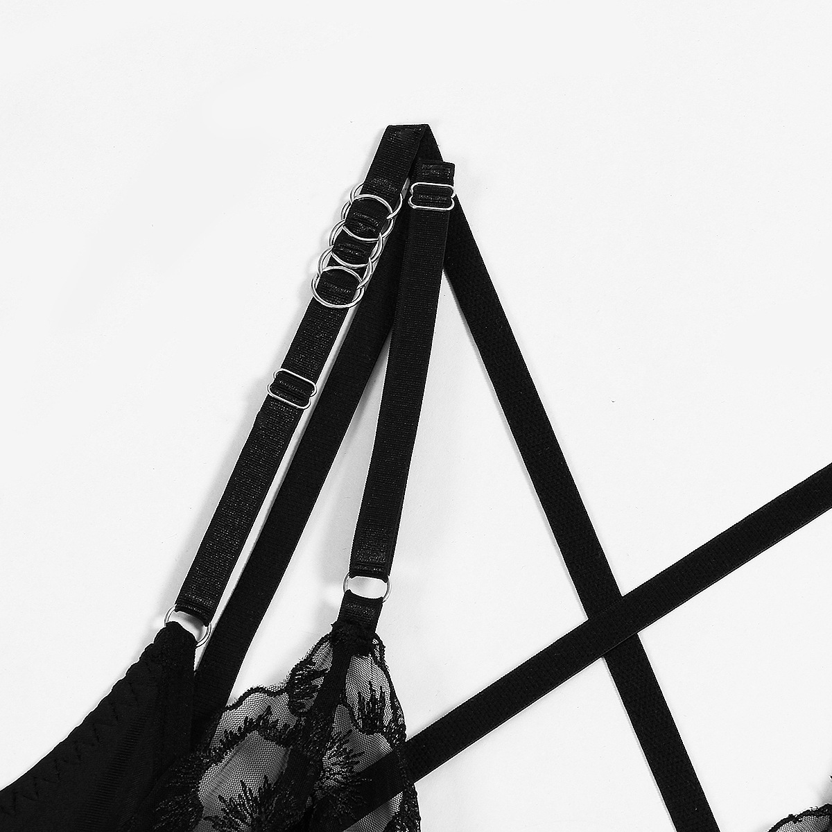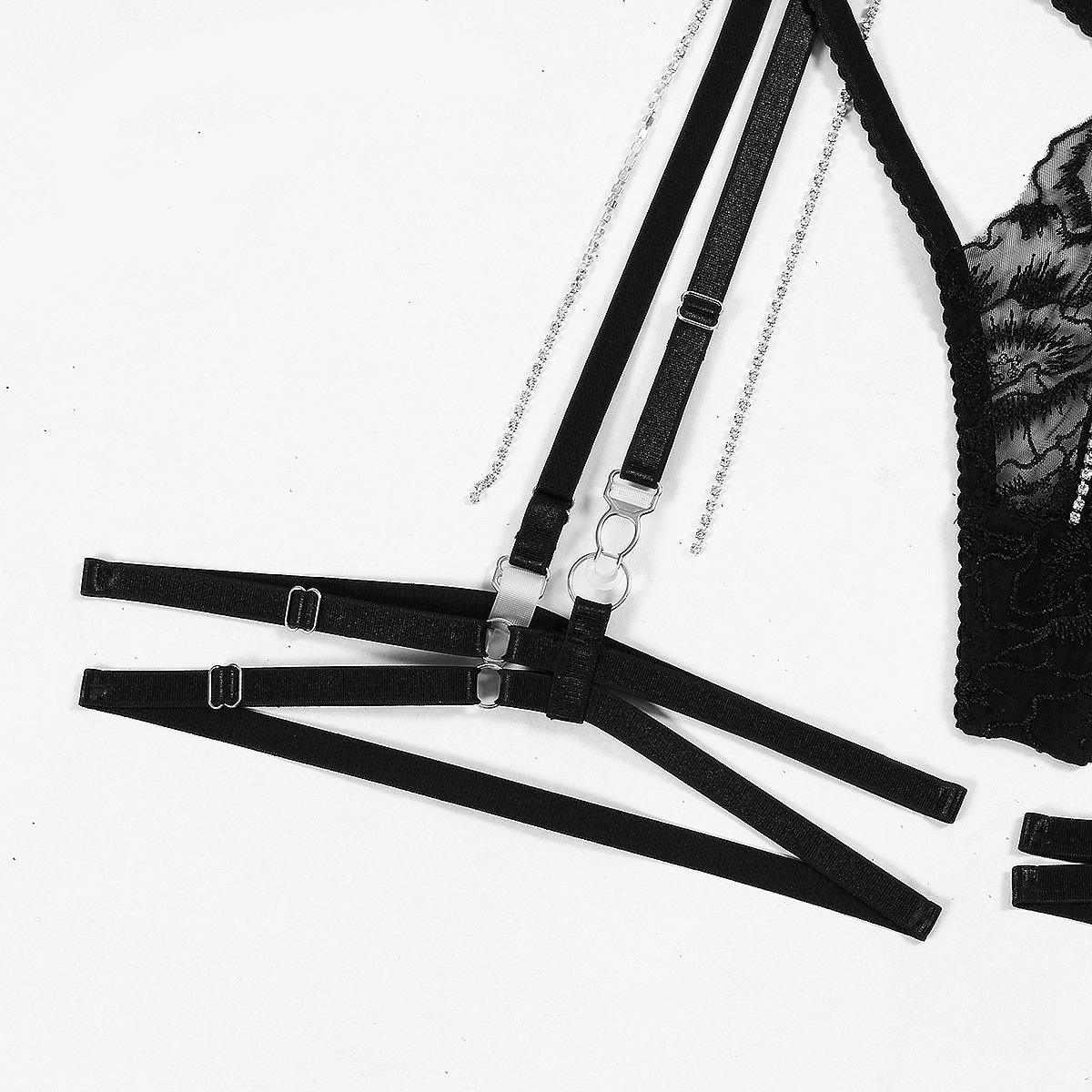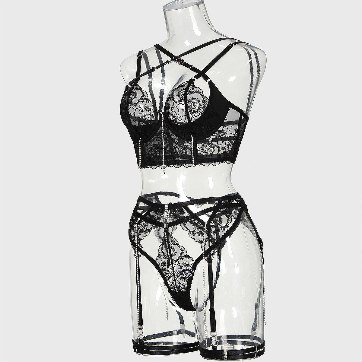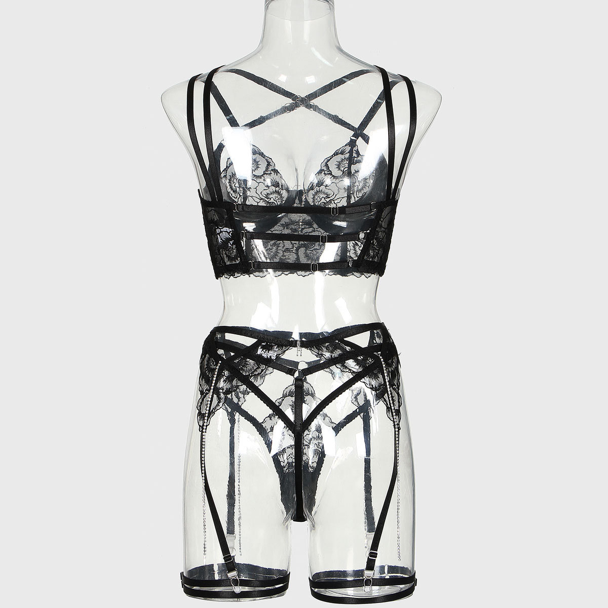 Complex Craft Sexy Cross Hollow Out Cutout Embroidery Body Shaping Drill Chain Sexy Lingerie Four Piece Set for Women
