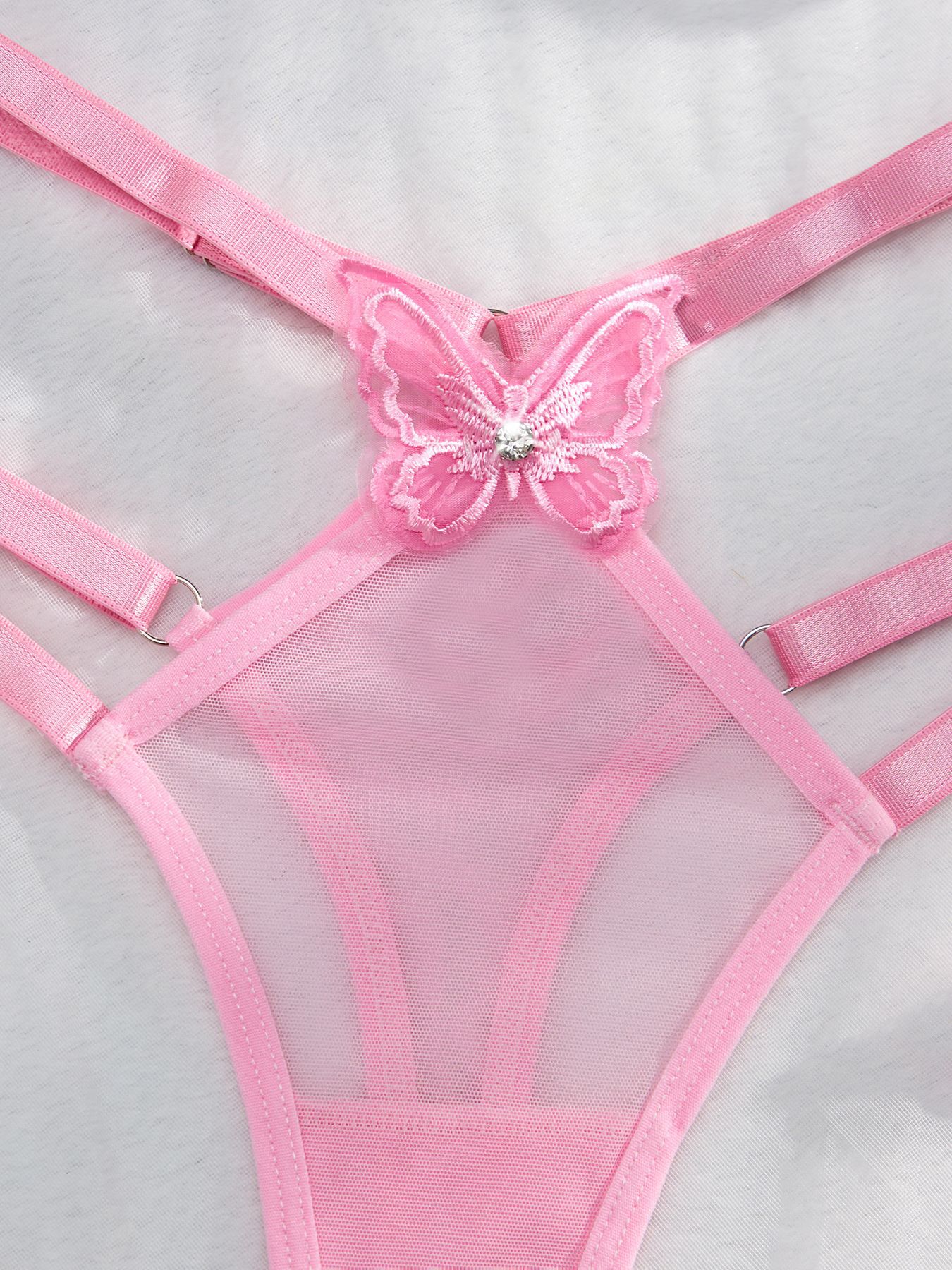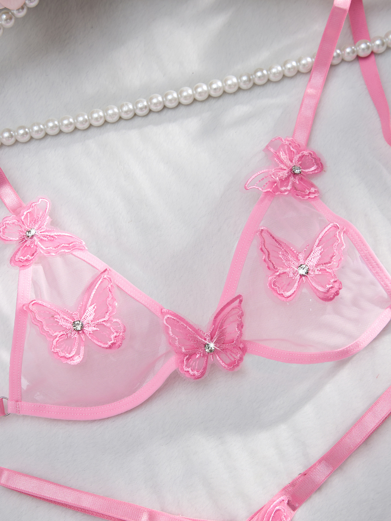 Cute Girl Lingerie Set Butterfly Embroidered Sheer Mesh Sexy Three Piece Set