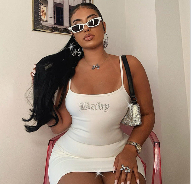 DA 3198B Letters Hot Rhinestone Thin Dress
