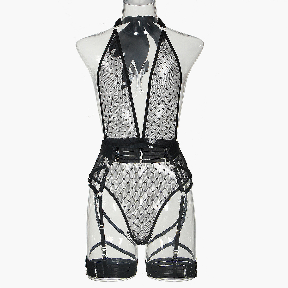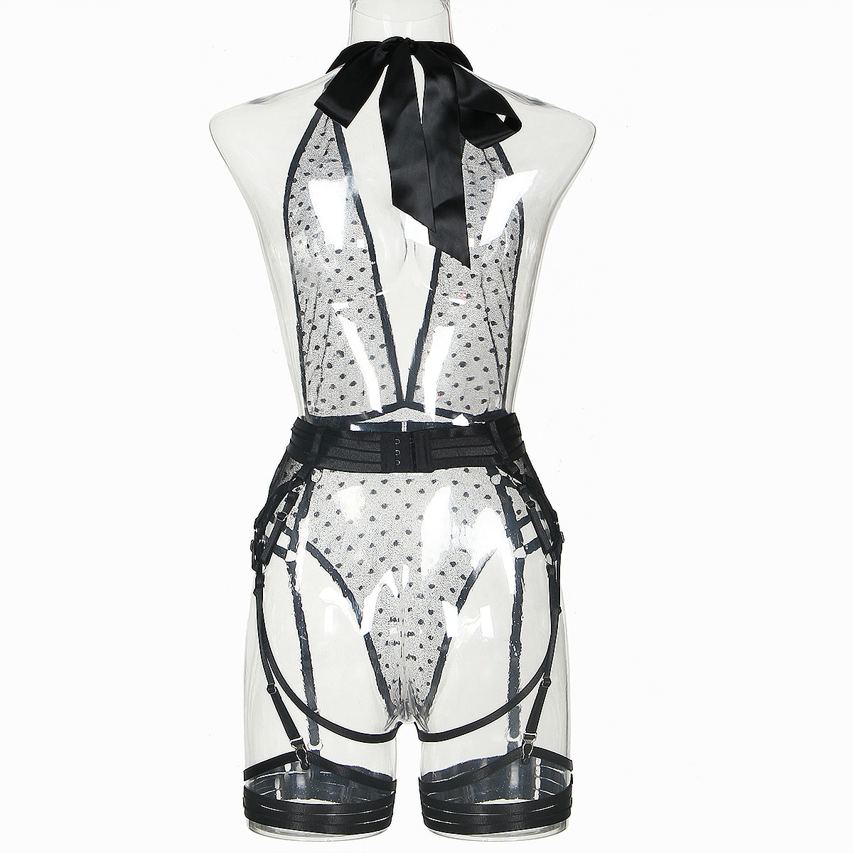 Dot Mesh Deep V Plunge Lace-up Halterneck Jumpsuit Sexy Beauty Back Five Piece Set for Women