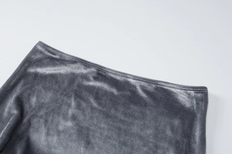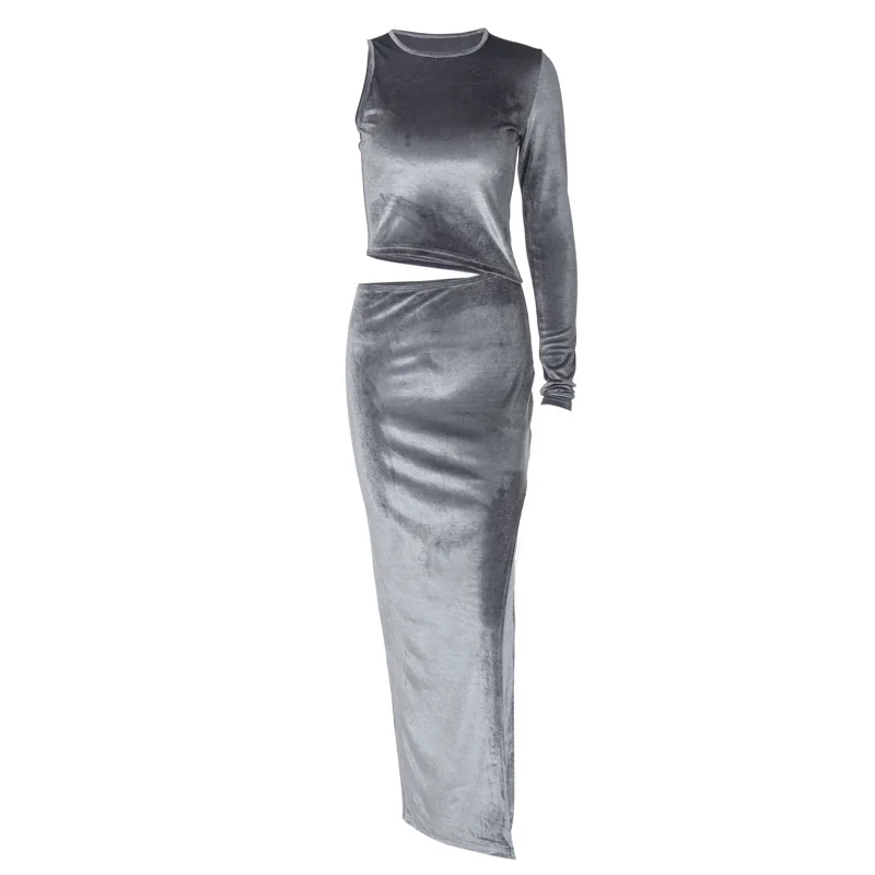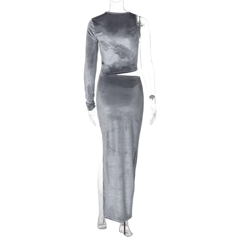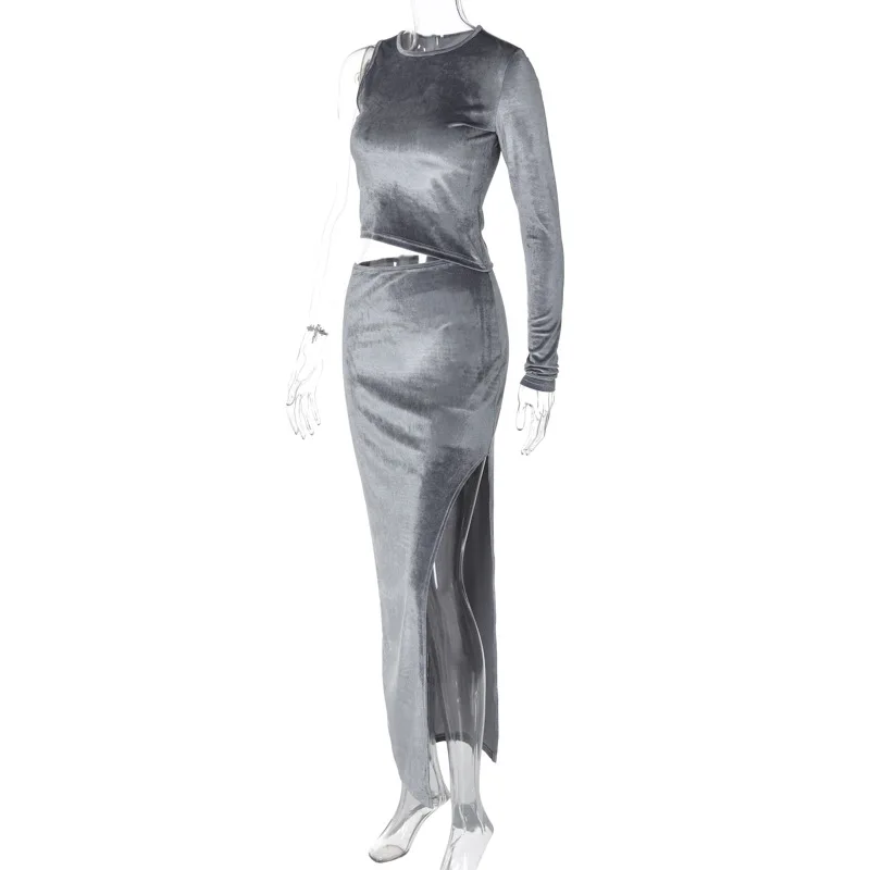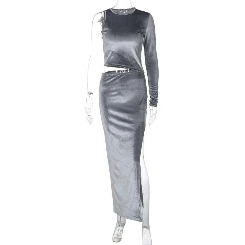 Dulzura Velvet Women 2 Piece Set Long Sleeve One Shoulder Crop Top Side Slit Midi Skirt Suits Elegant Matching Outfits Party