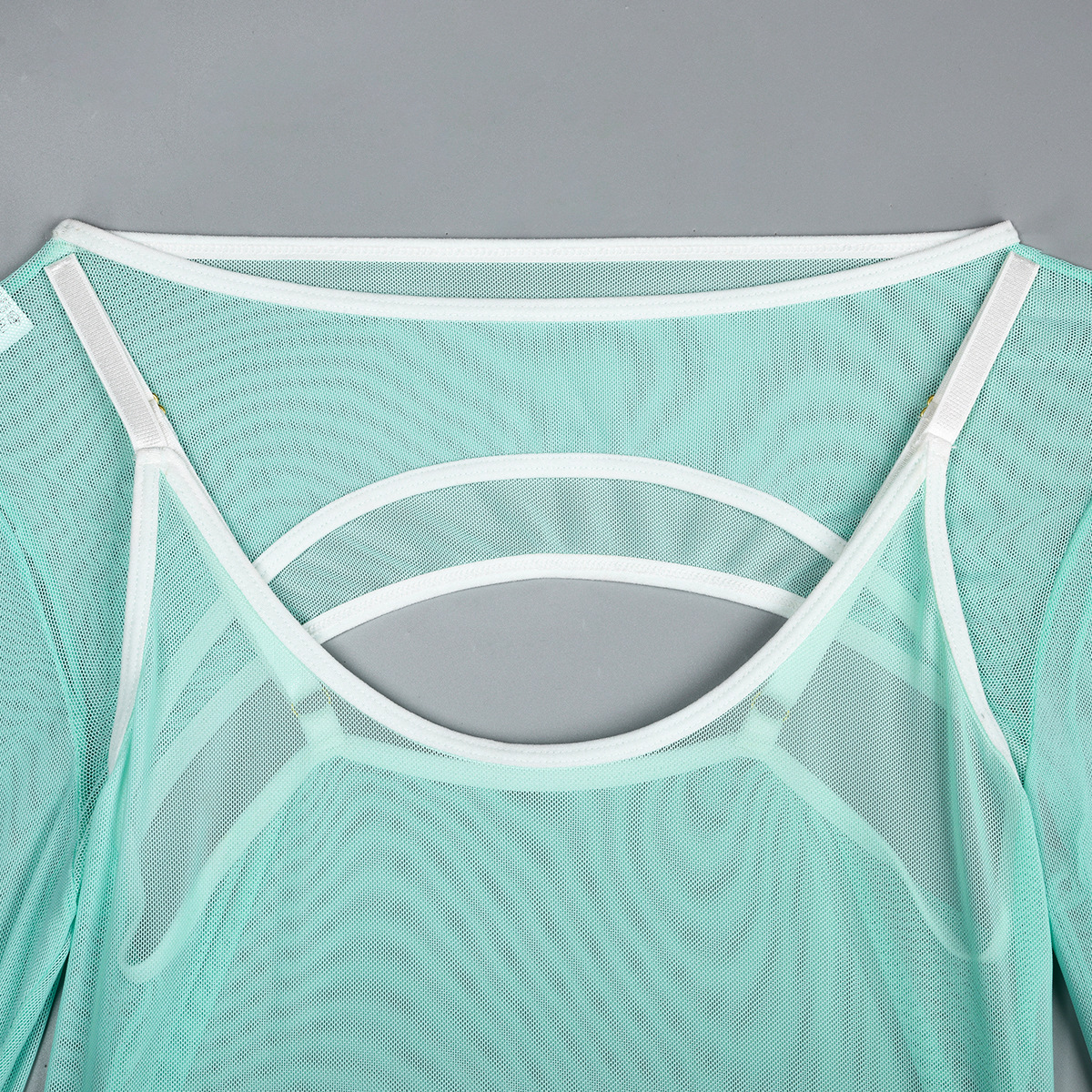 Elastic Mesh See through Contrast Color Cover Long Sleeve with Sleeveless Jumpsuit Sexy Lingerie Three Piece Set