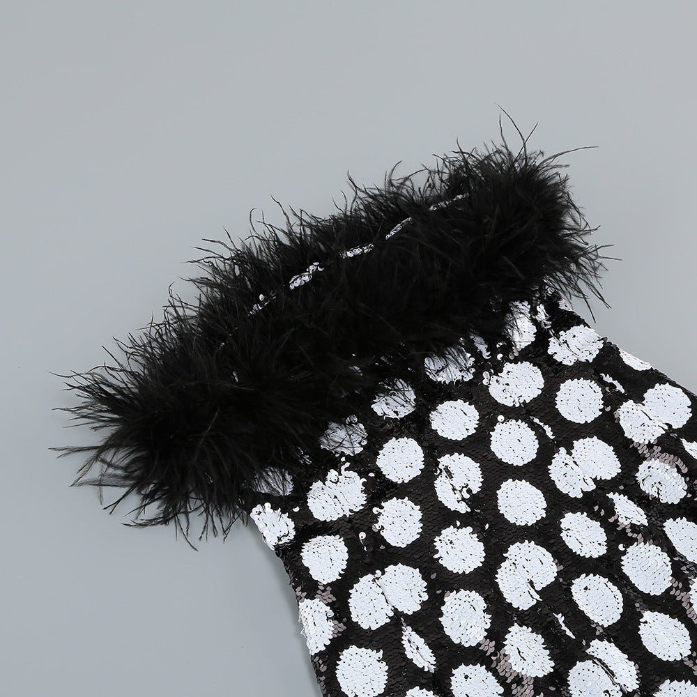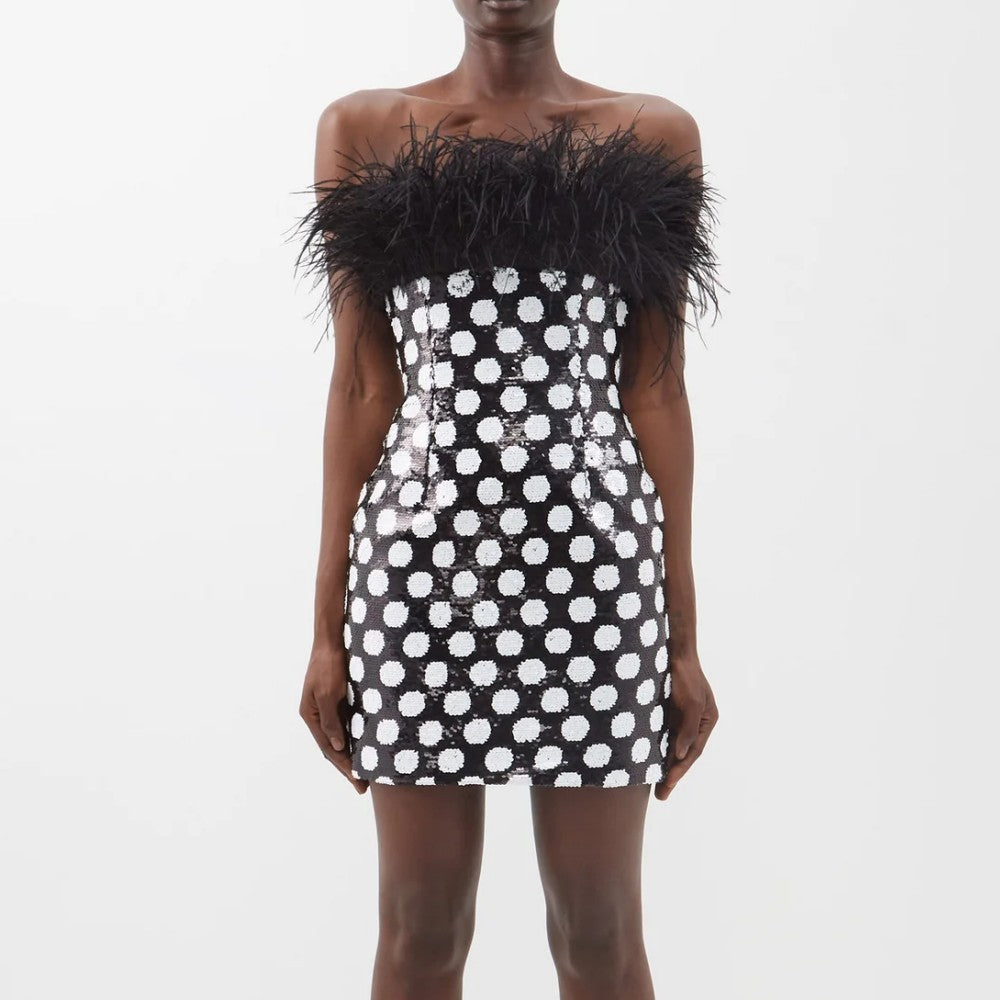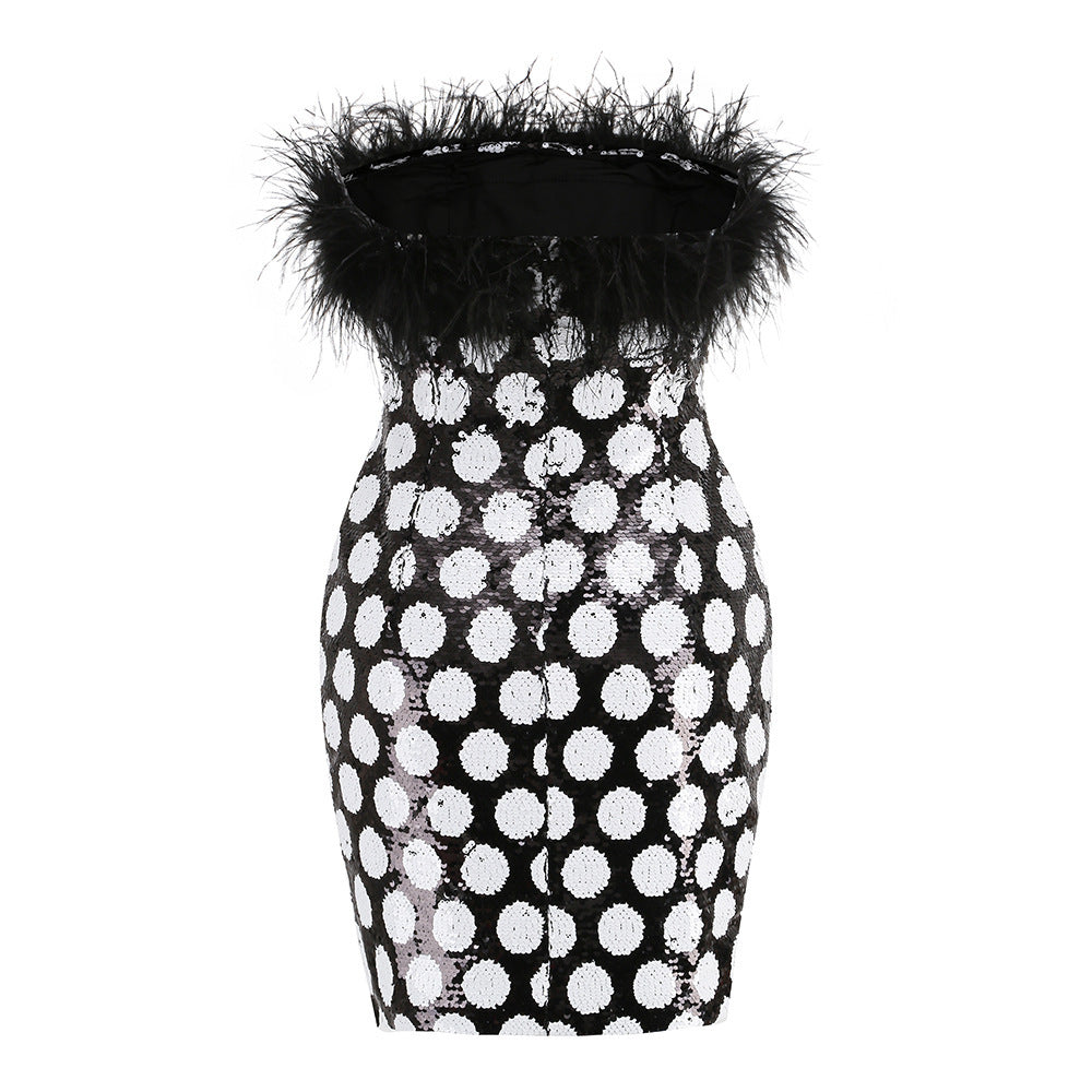Elegant Sexy Off-the-shoulder Hot Girl Feather Tube Top Printed Slim Mini Sheath Dress