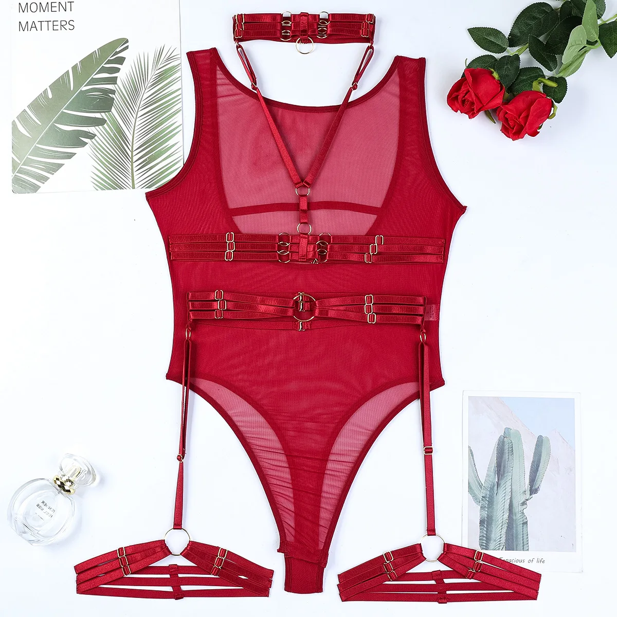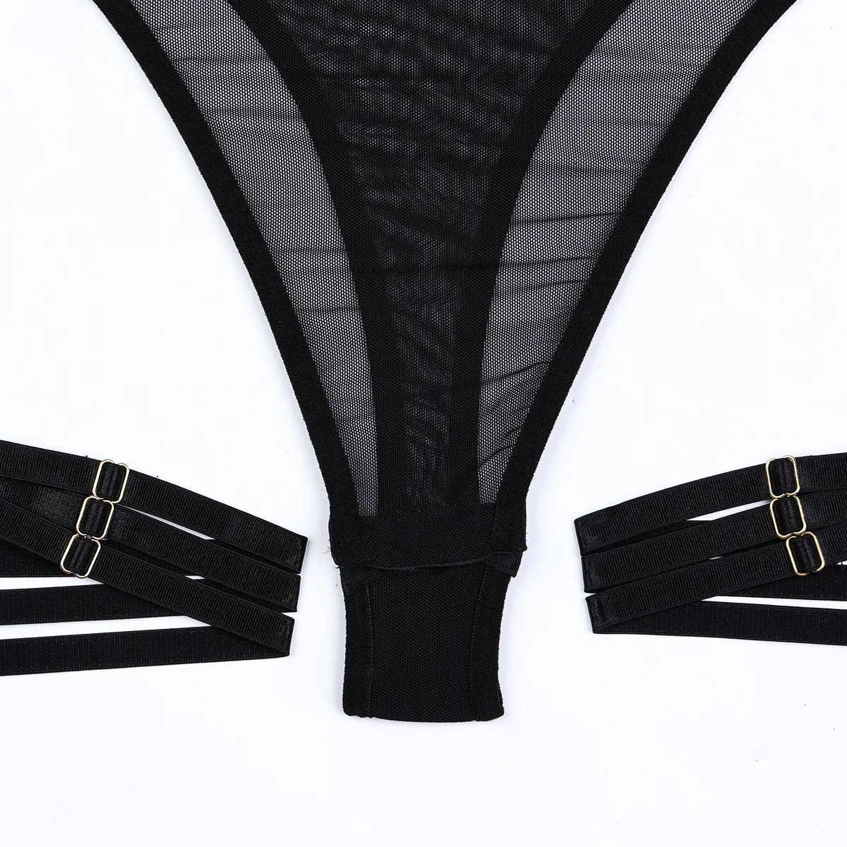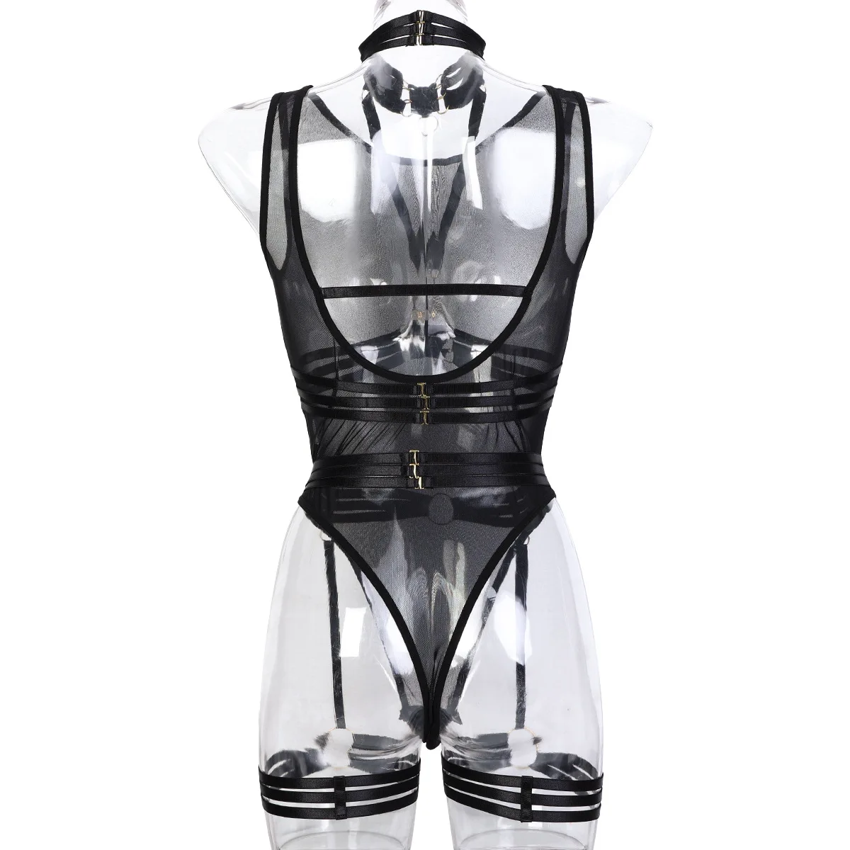 Ellolace Erotic Porn Lingerie Bodysuit Transparent Mesh Body With Garter See Through Crotchless Sex Suit Open Crotch Costume