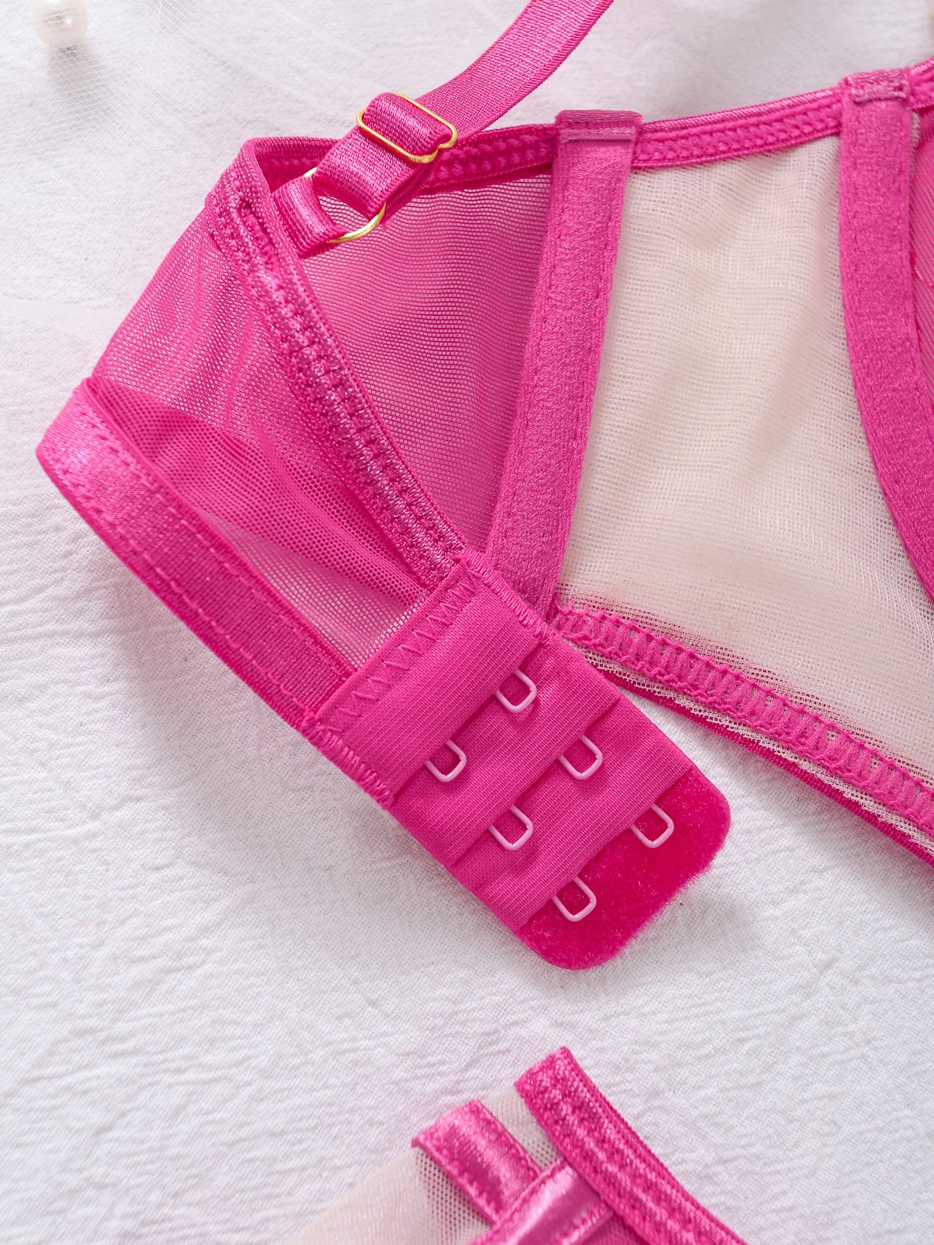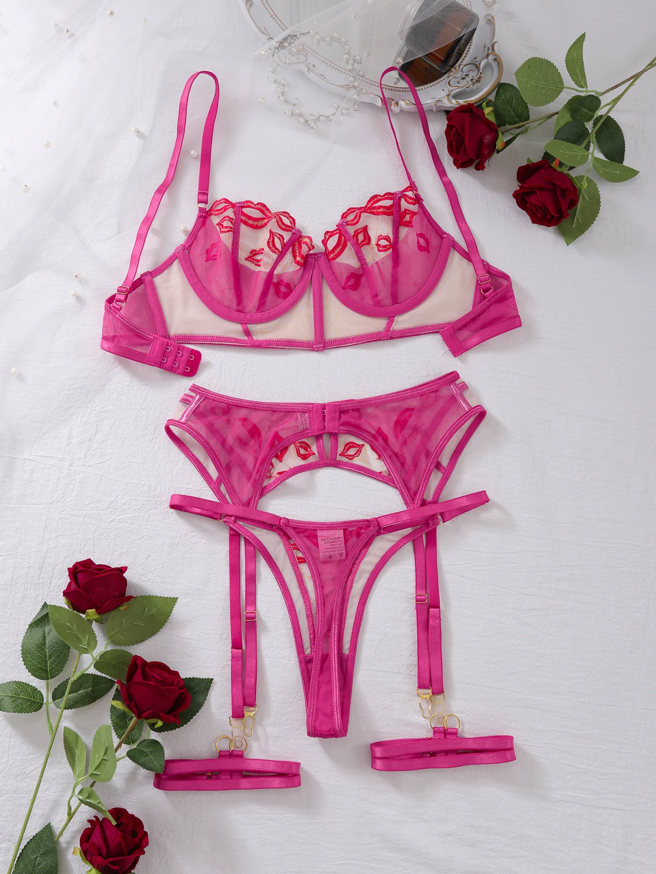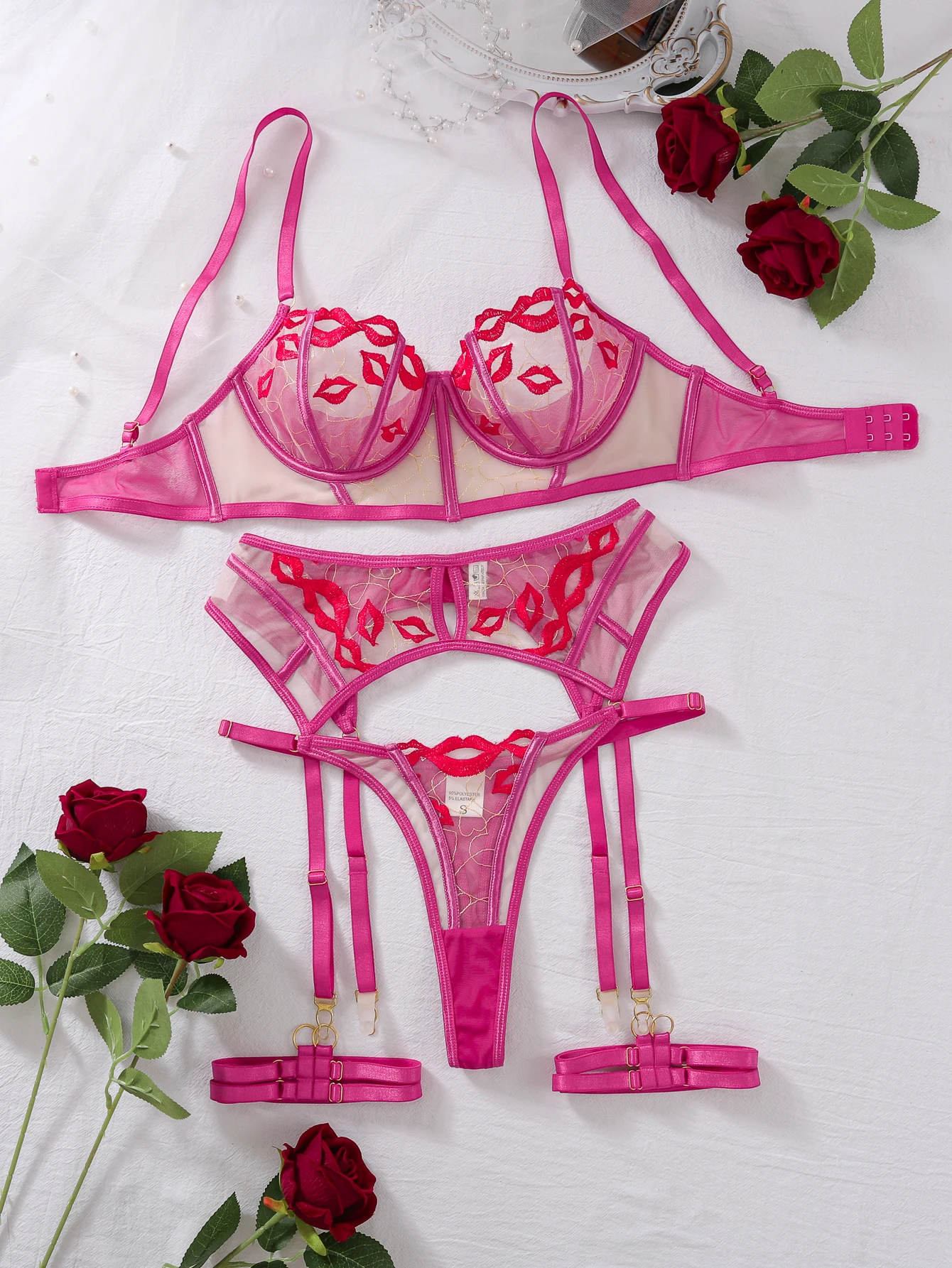 Ellolace Fancy Lingerie Red Lips Embroidery Lace Delicate Bra Sissy Tulle Underwar Uncensored Onlyfans Kit Ensemble 5-Piece