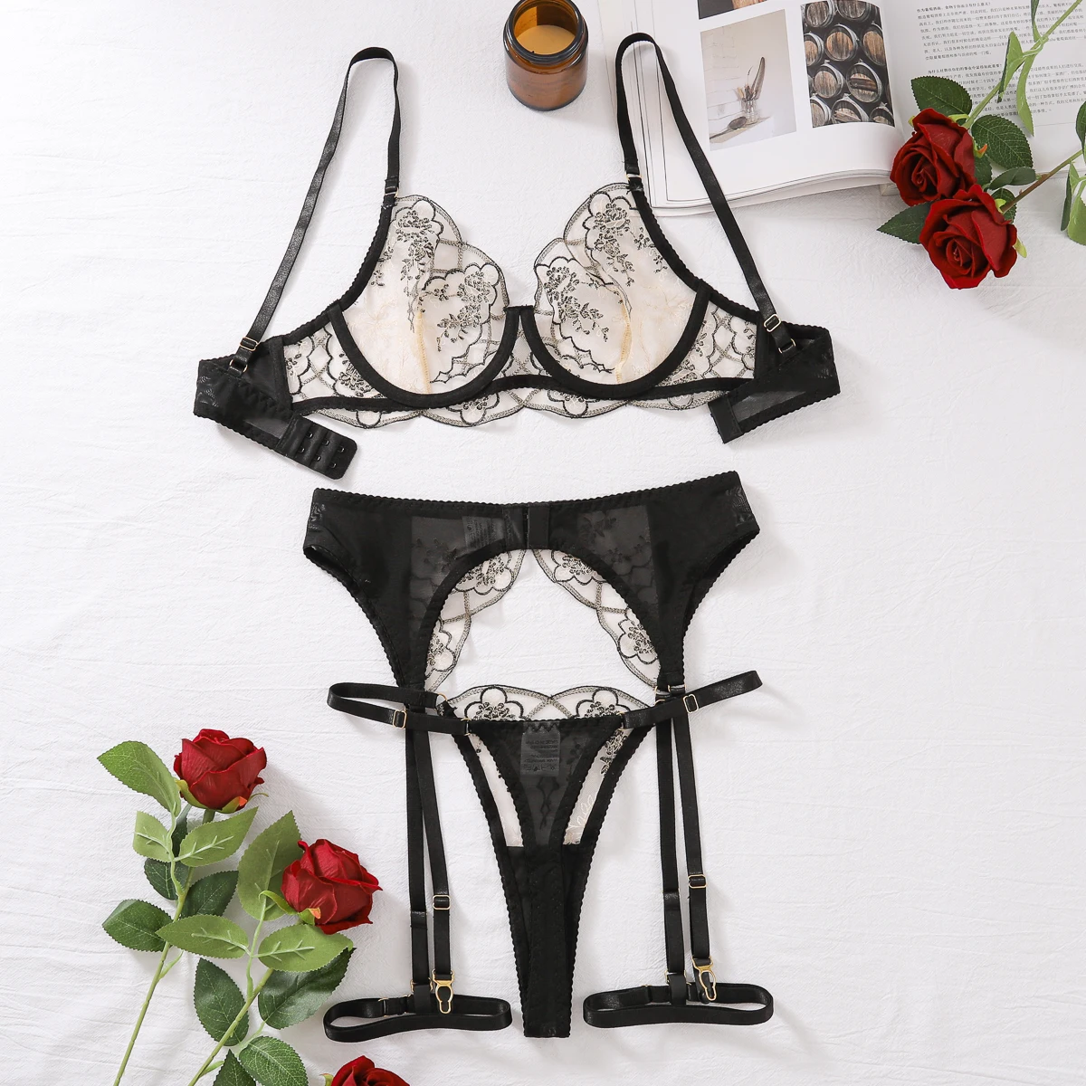 Ellolace Fancy Lingerie Set For Chubby See Through Push Up Bra Attractive Chest Suspenders g-String Luxury Erotic Underwear