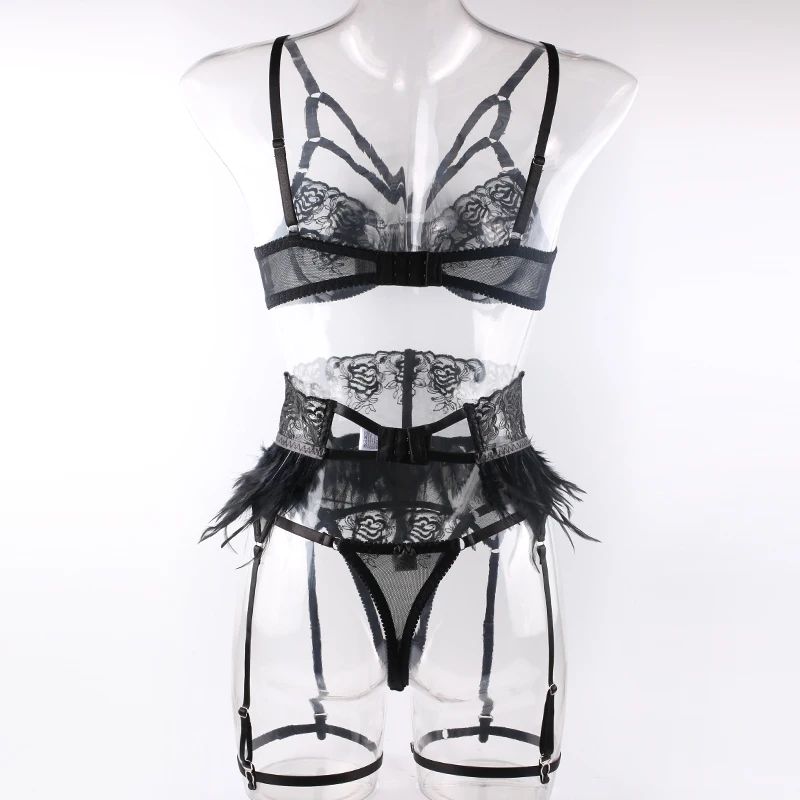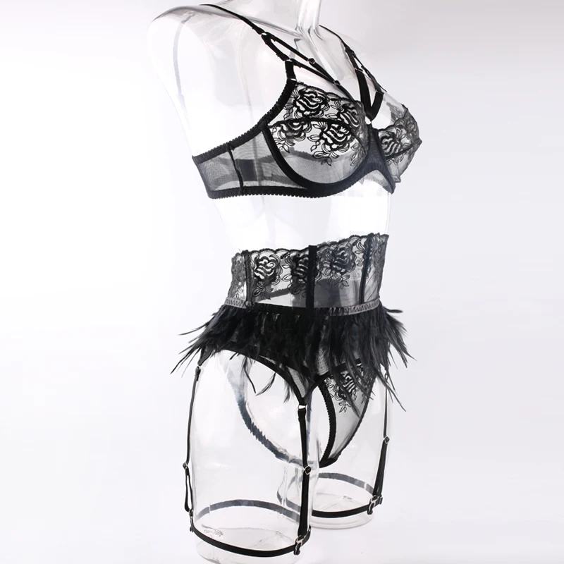 Ellolace Feather Lingerie Embroidery Fancy Female Underwear Transparent Bra Luxury Lace Intimate Delicate Erotic Brief Sets