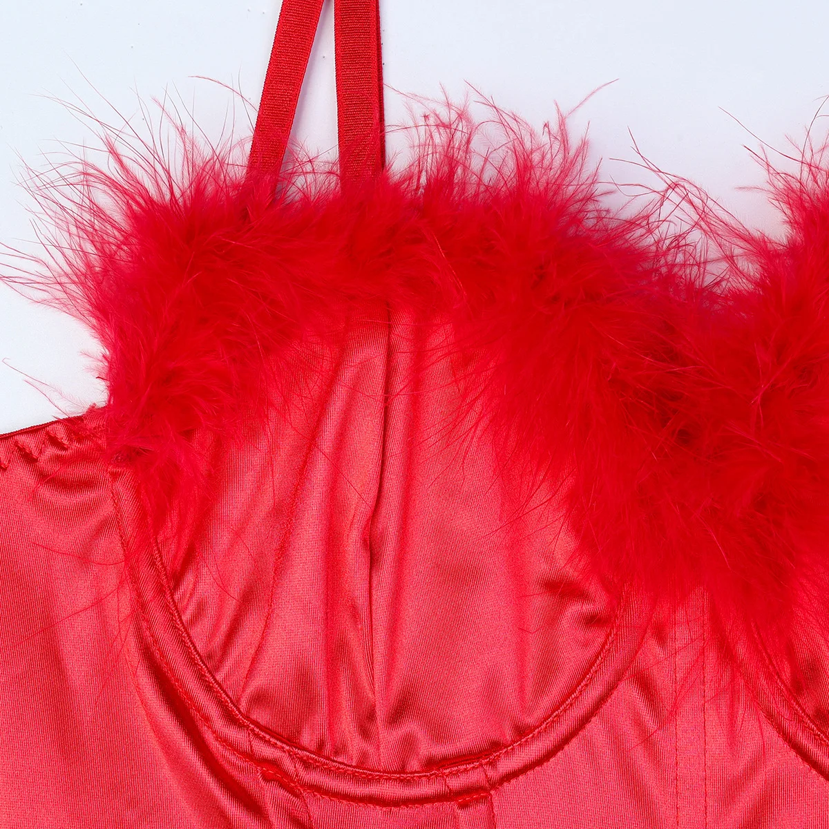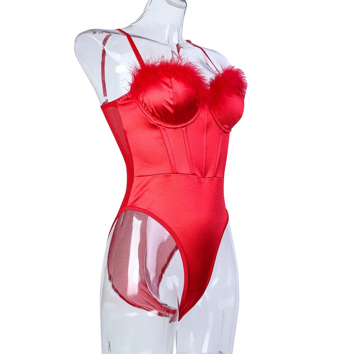 Ellolace Feather Silk Bodysuit Sissy Elegant Women's Clothing Open Crotch Sleeveless Tops Santa Valentine Fantasy Hot Red Body