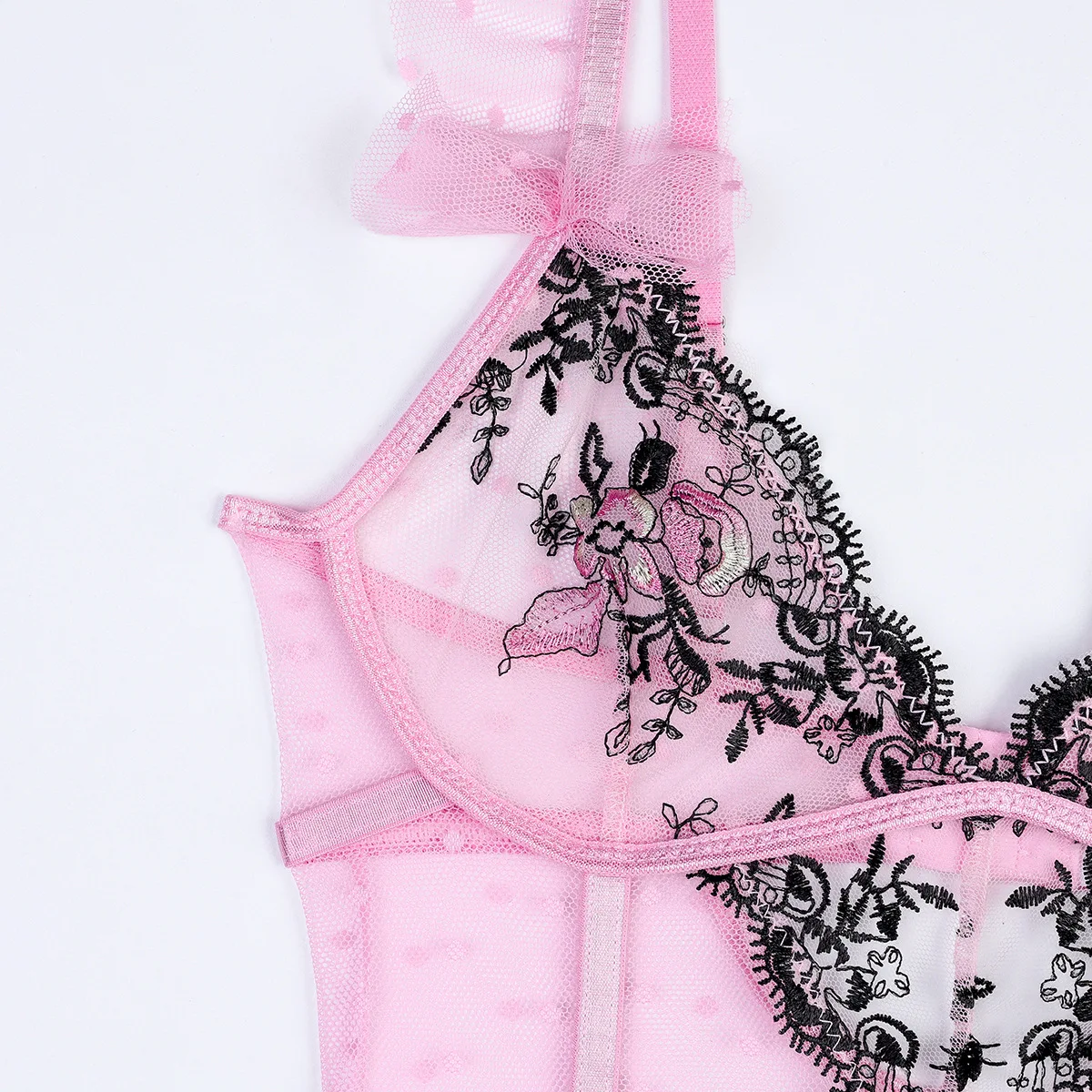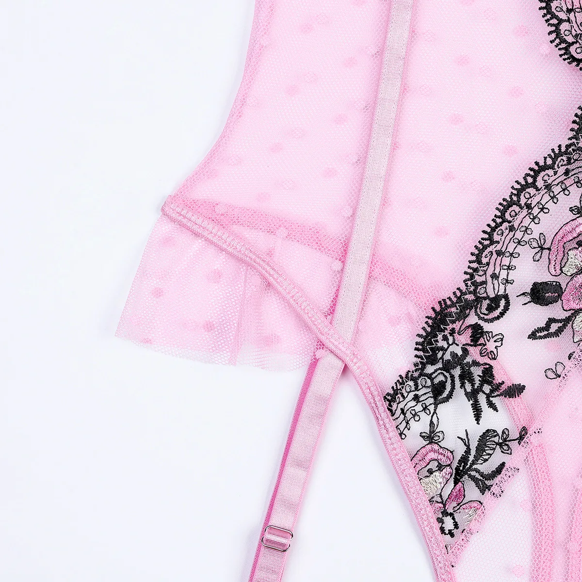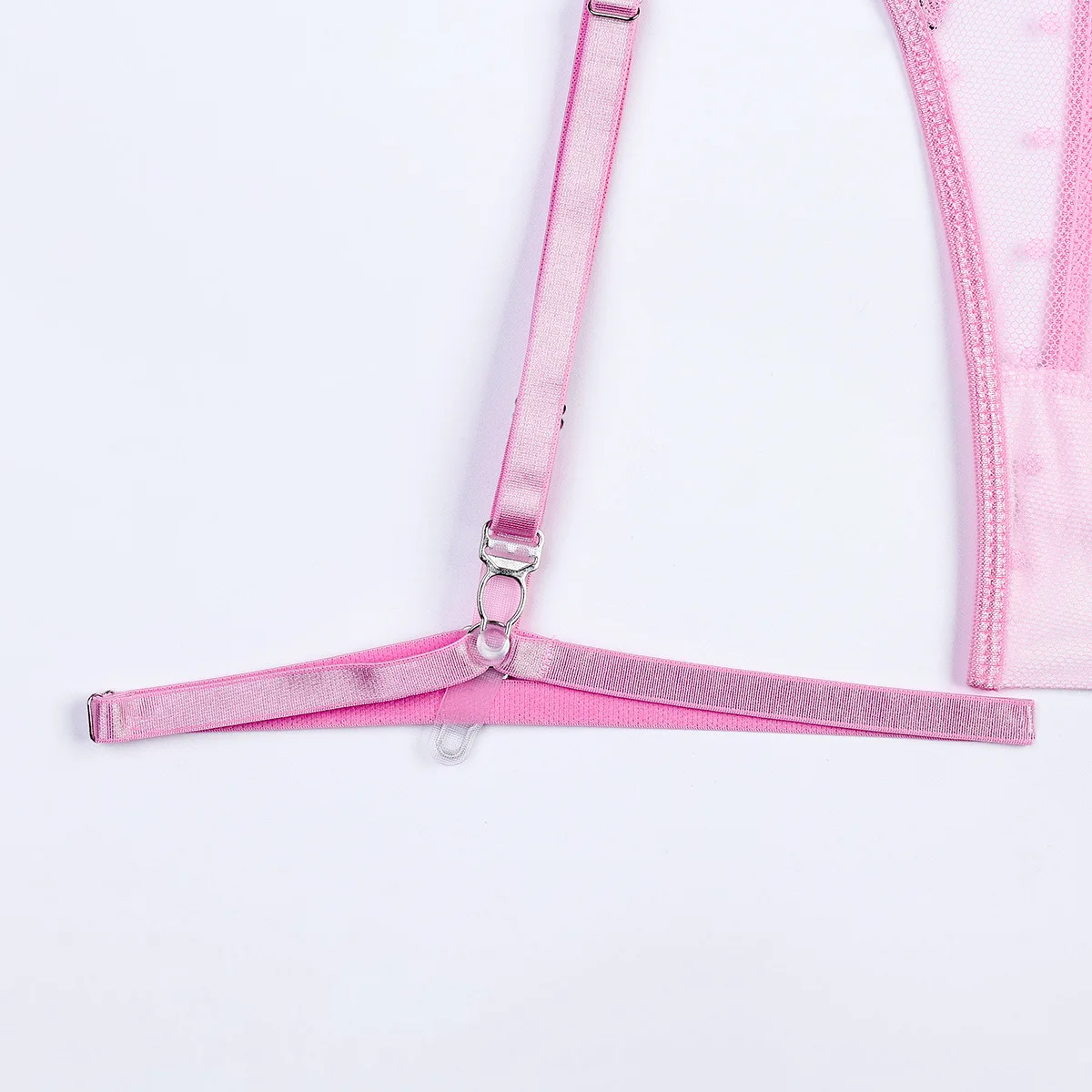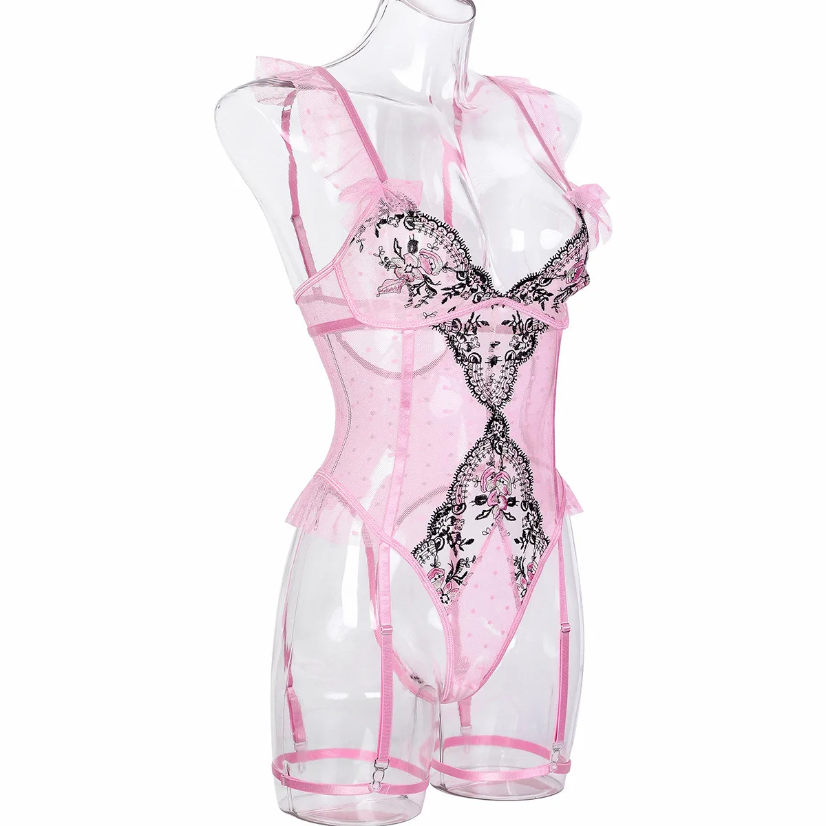 Ellolace Floral Lingerie Bodysuit Women Lace Strap See Through Polka Dot Lingerie Sissy Cute Bodys Pink One Piece Cute Bodys