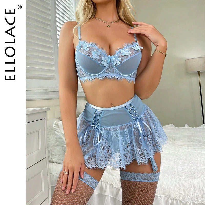 Ellolace FloralLove Fancy Women's Sexy Lingerie Set 5pcs Attractive Lace Erotic Bra Sets With Stocking Sissy Costume