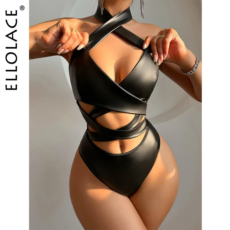 Ellolace Halter Neck Patent Leather Body Youthful Woman Clothes Bandage Lockable Body Suit Sissy One Piece Black Top Women