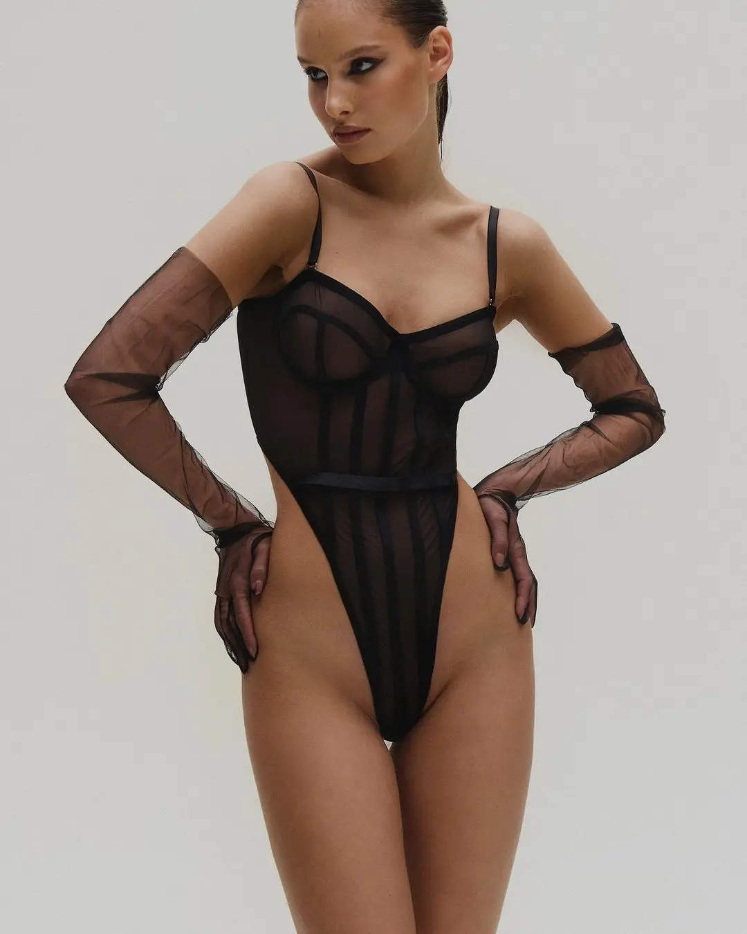 Ellolace Lace Bodysuit One Piece Tops Sheer Lace See Through Tight Fitting Black High Cut Fitness Body Tights