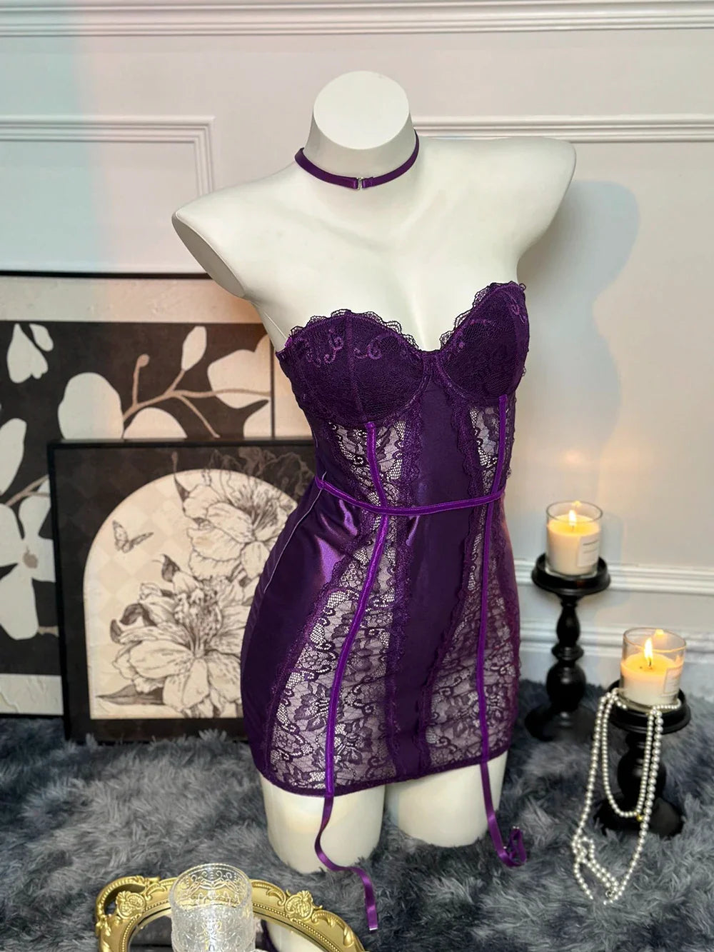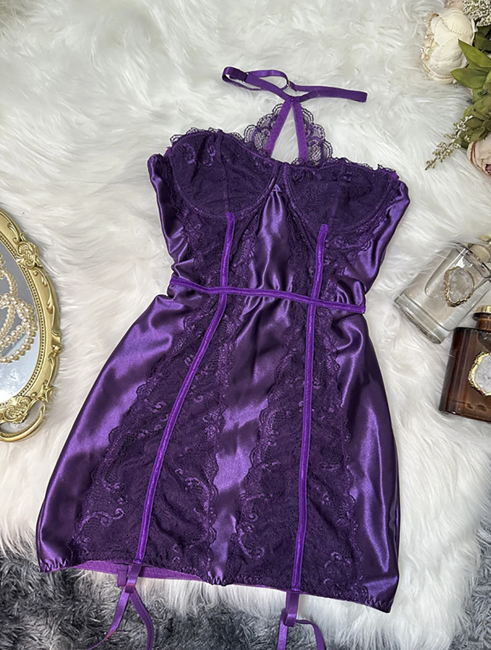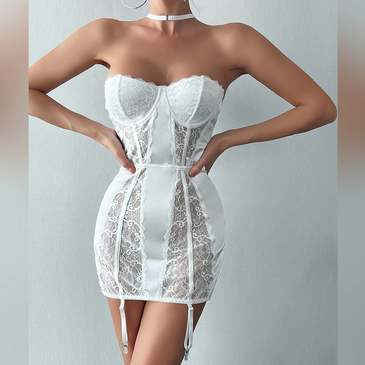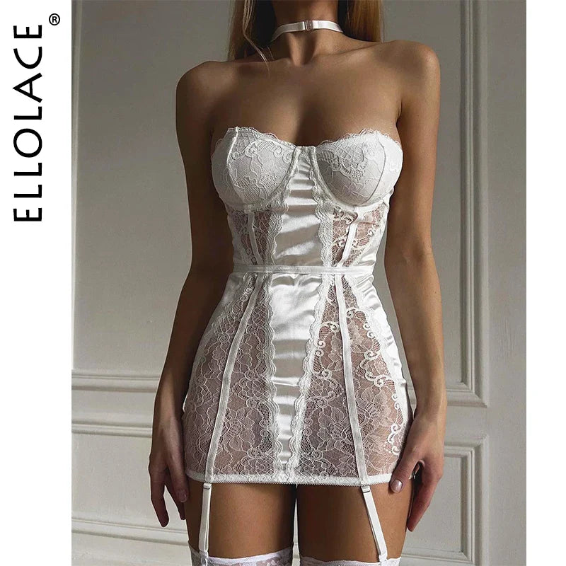 Ellolace Lace Halter Erotic Dress See Through Super Mini Dresses Sissy Daring Bodycon Statin Patchwork Sexy Clothes