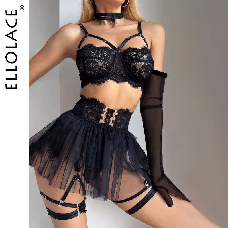 Ellolace Lace Lingerie With Long Gloves See Through Bra Ruffle Suspenders Fantasy Underwear Sexiest Fancy Erotic Outfits