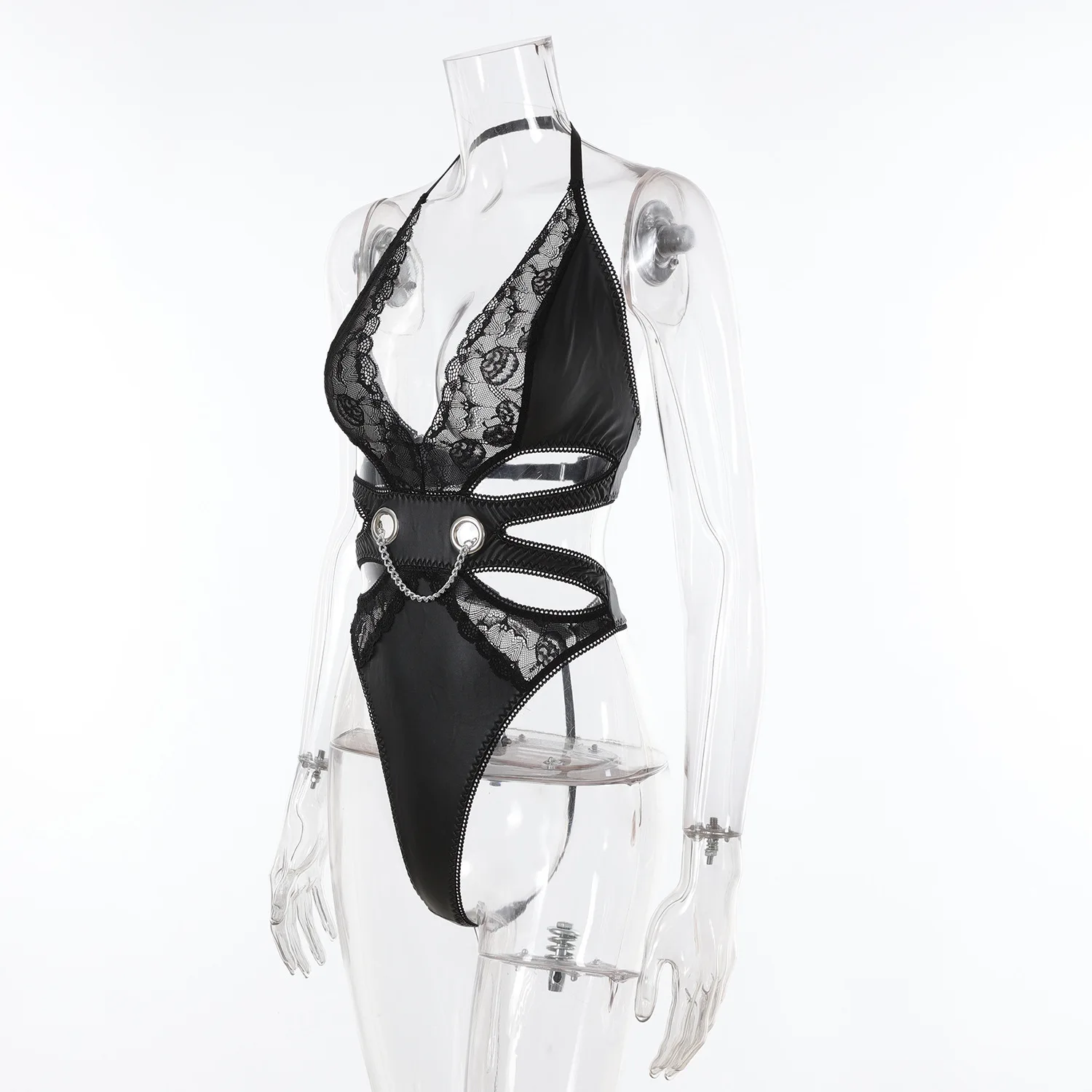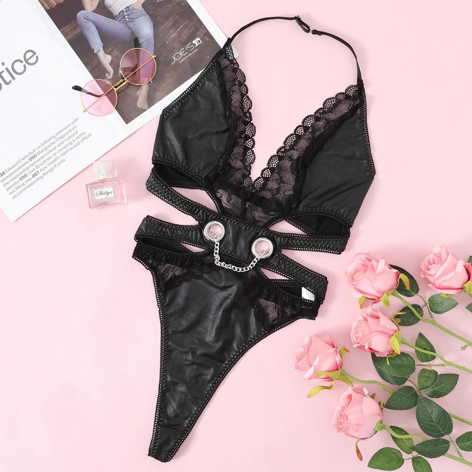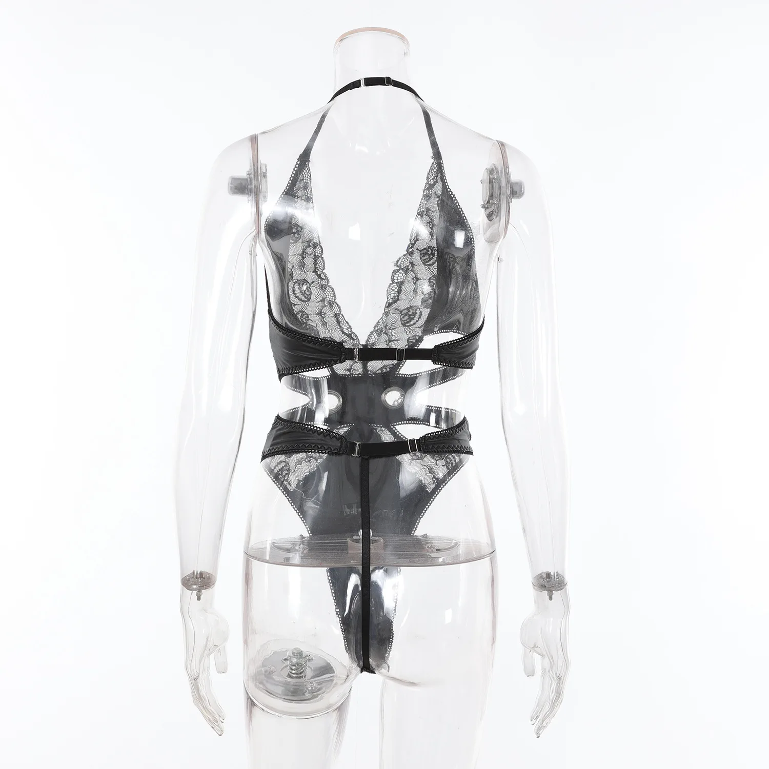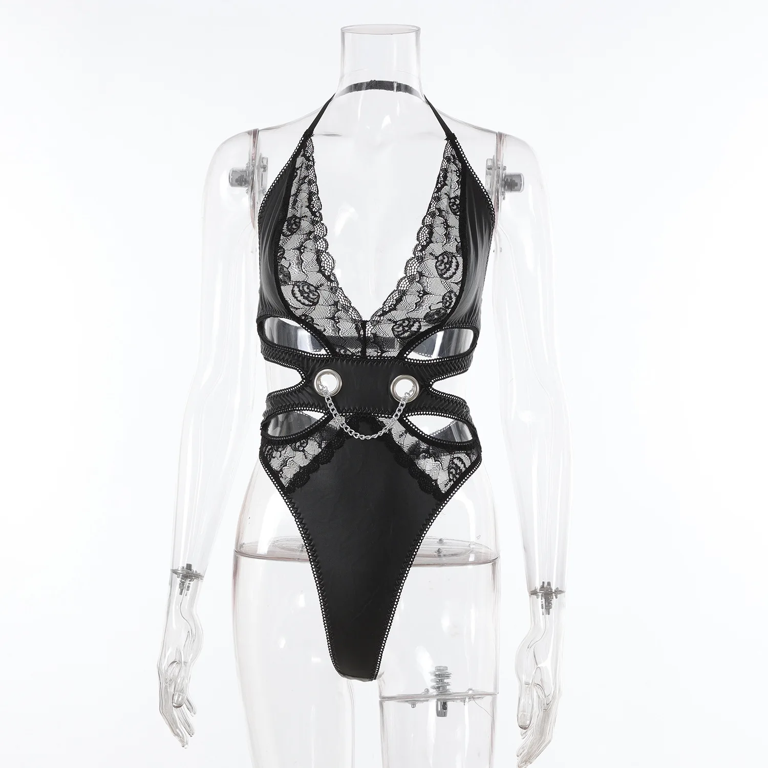 Latex Bodysuit Deep-V Halter Tops Cut Out Waist Baby Dolls Body Mujer Night Club Fancy Lace Body Costume