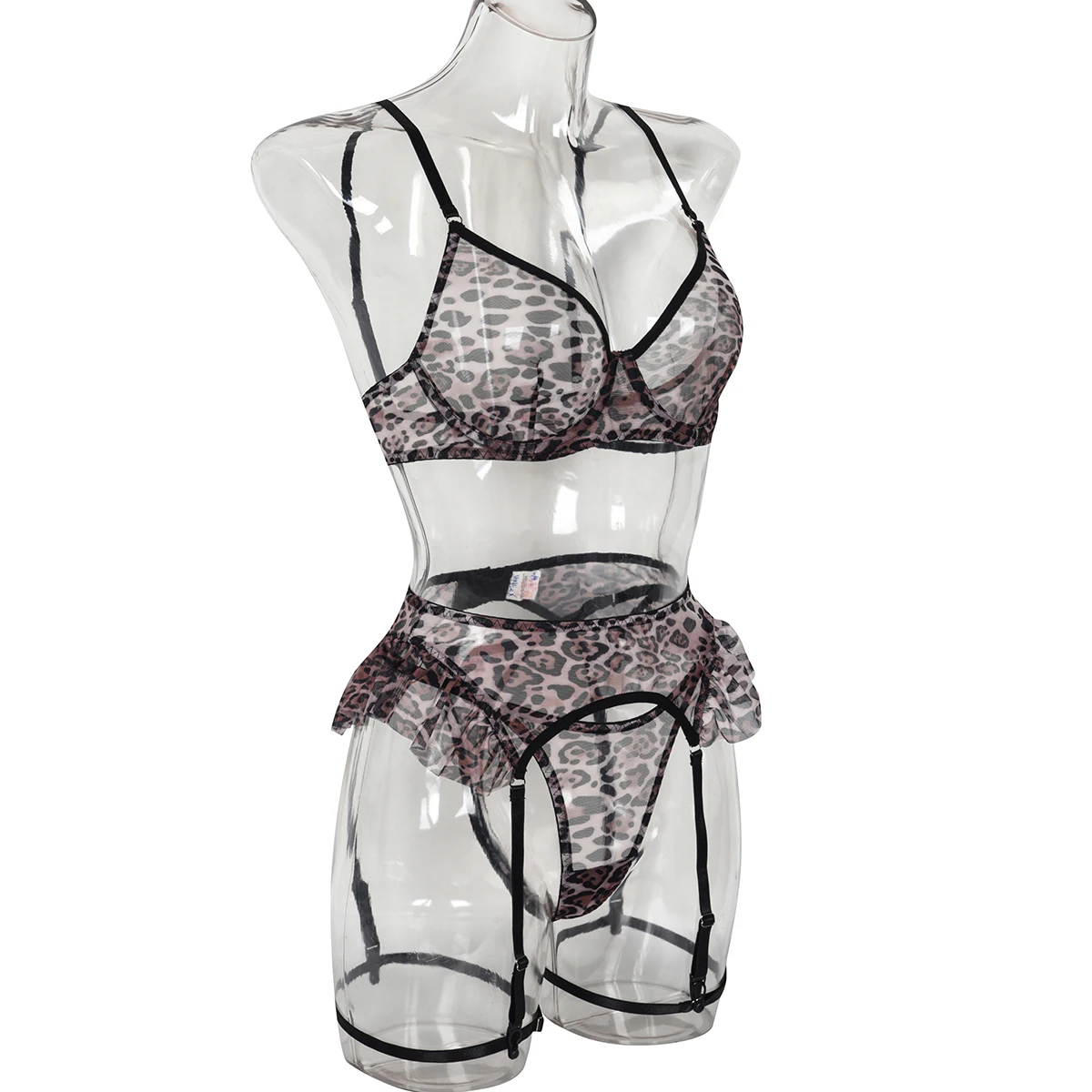 Leopard Exotic Lingerie See Through Lace Underwear Seamless Bra Ruffle Garter Intimate Sheer y Outfit