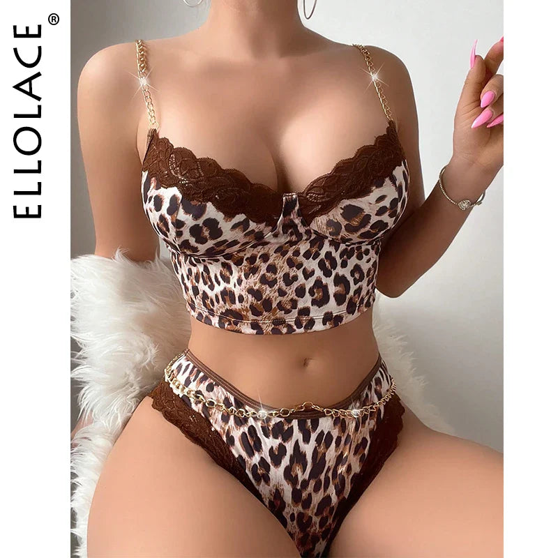 Ellolace Leopard Lingerie With Chain Strap Lace Seamless Underwear Women Comfort Home Set Fashion Sexy Outfits Brief Sets