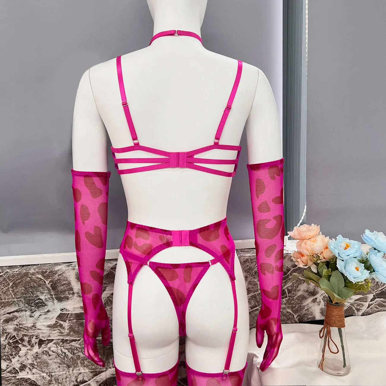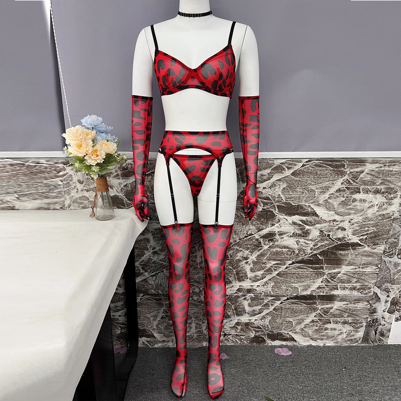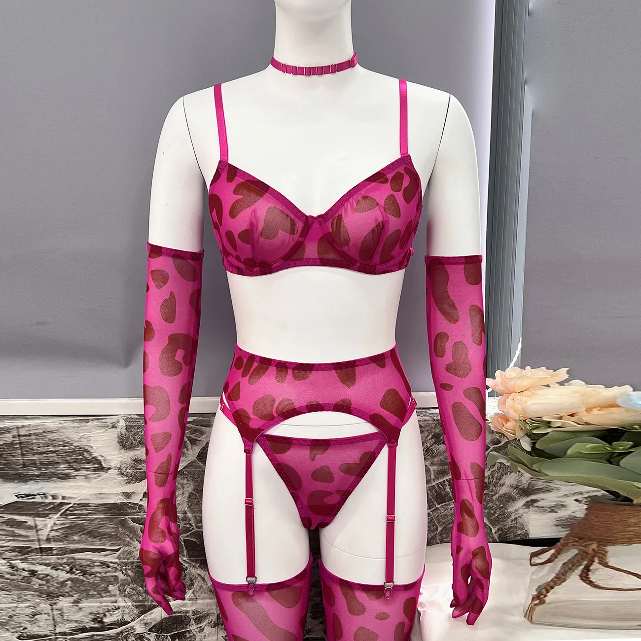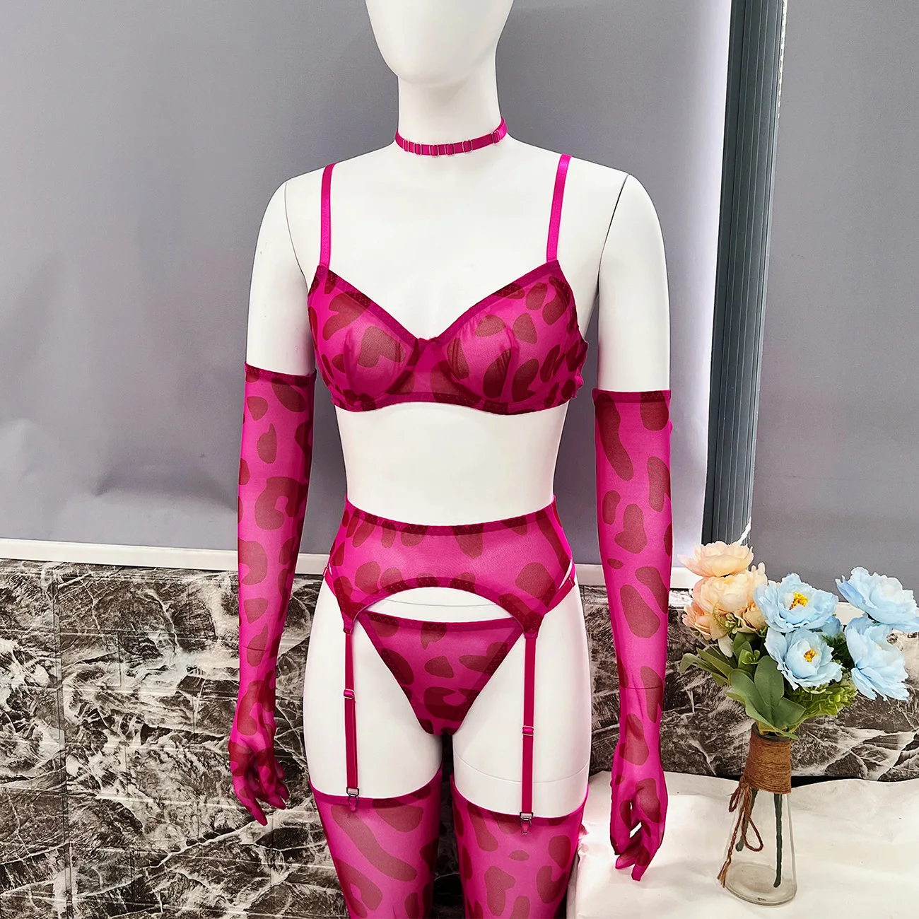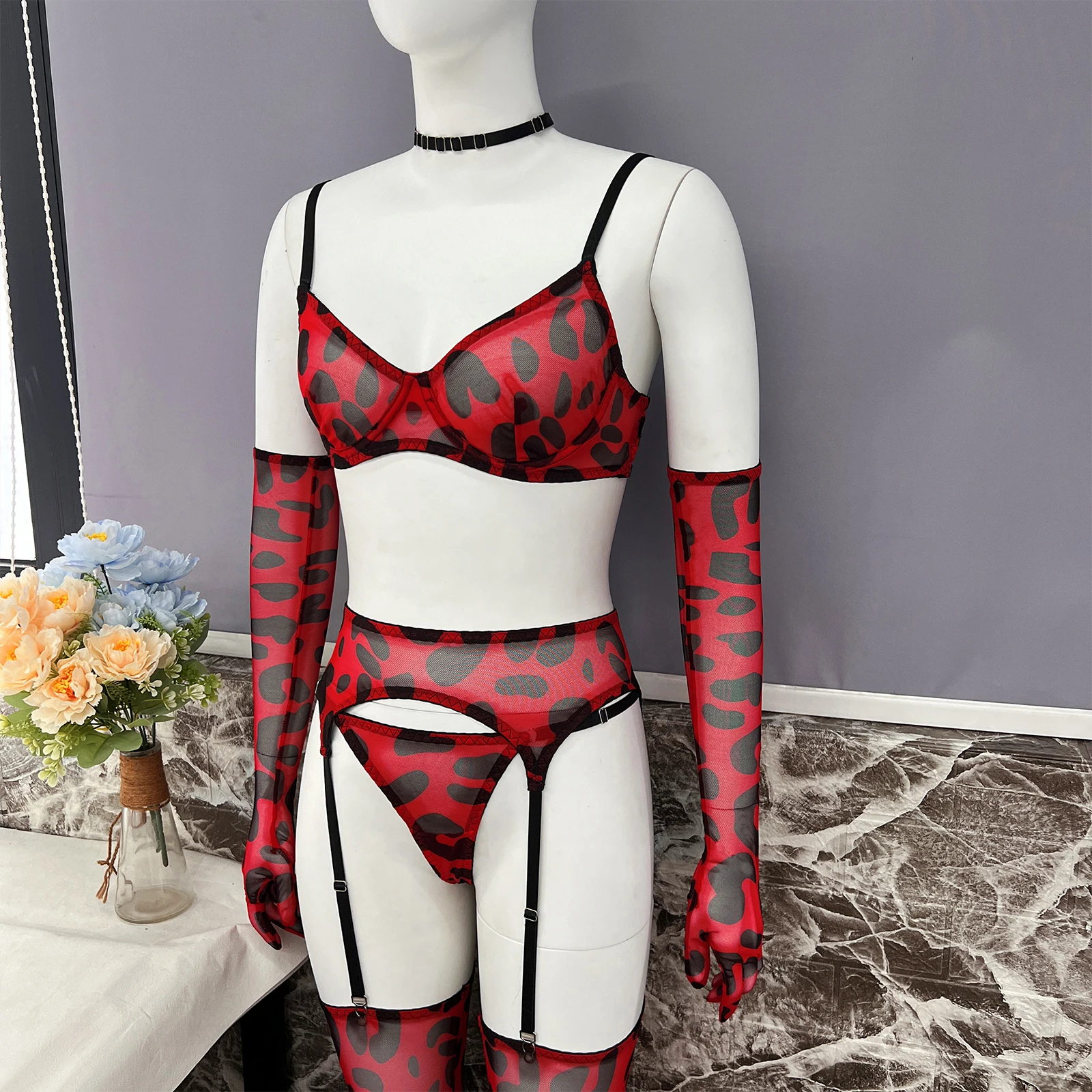 Ellolace Leopard Lingerie With Stocking Gloves Fancy Seamless Underwear 6-Piece Garter Belt Set Intim Goods Lace Exotic Sets
