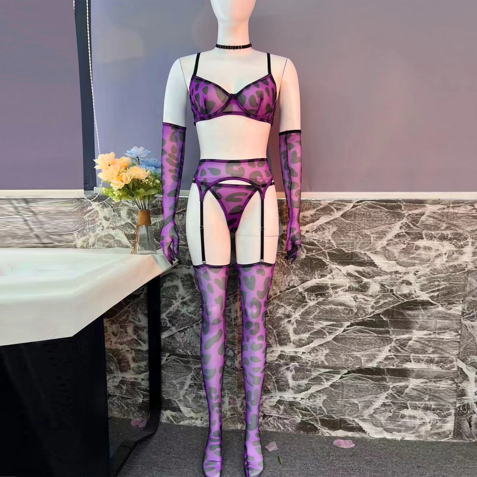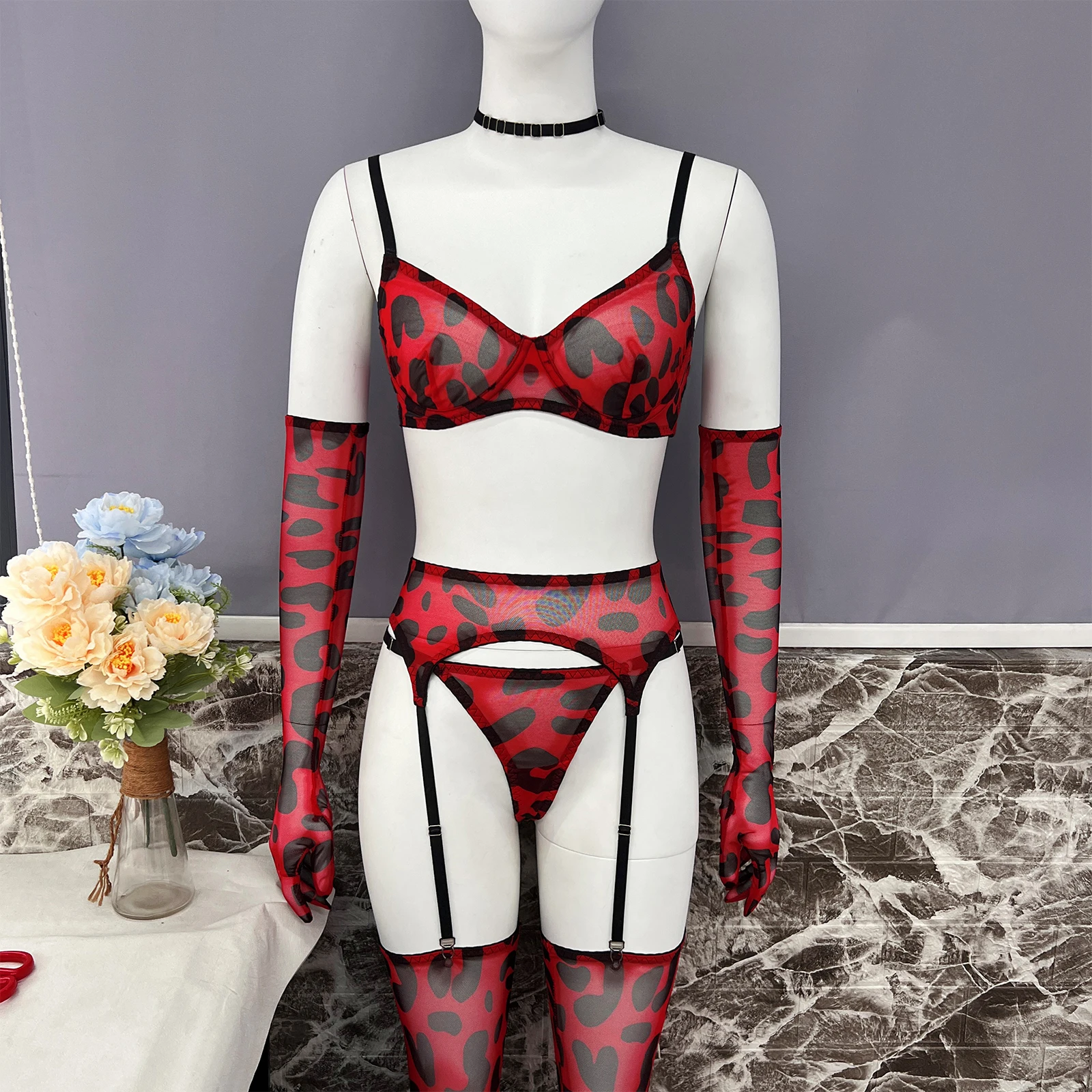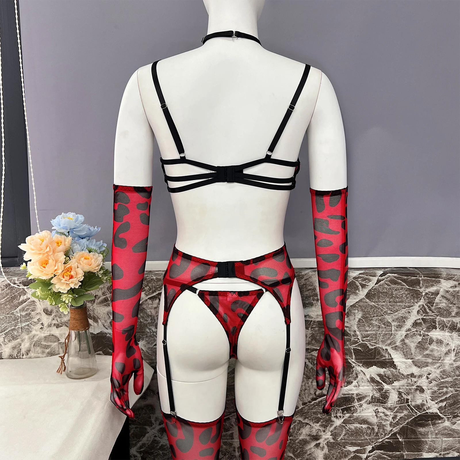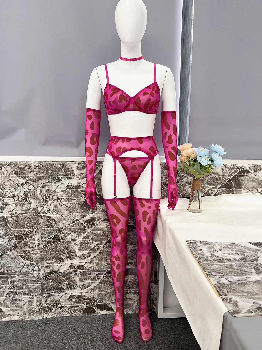 Ellolace Leopard Lingerie With Stocking Gloves Fancy Seamless Underwear 6-Piece Garter Belt Set Intim Goods Lace Exotic Sets