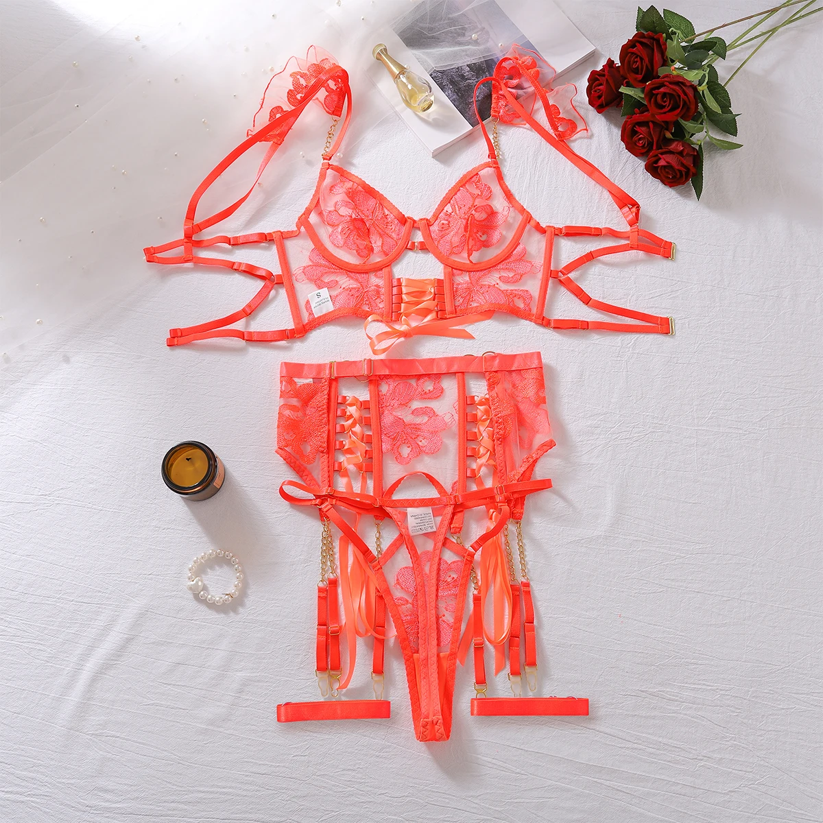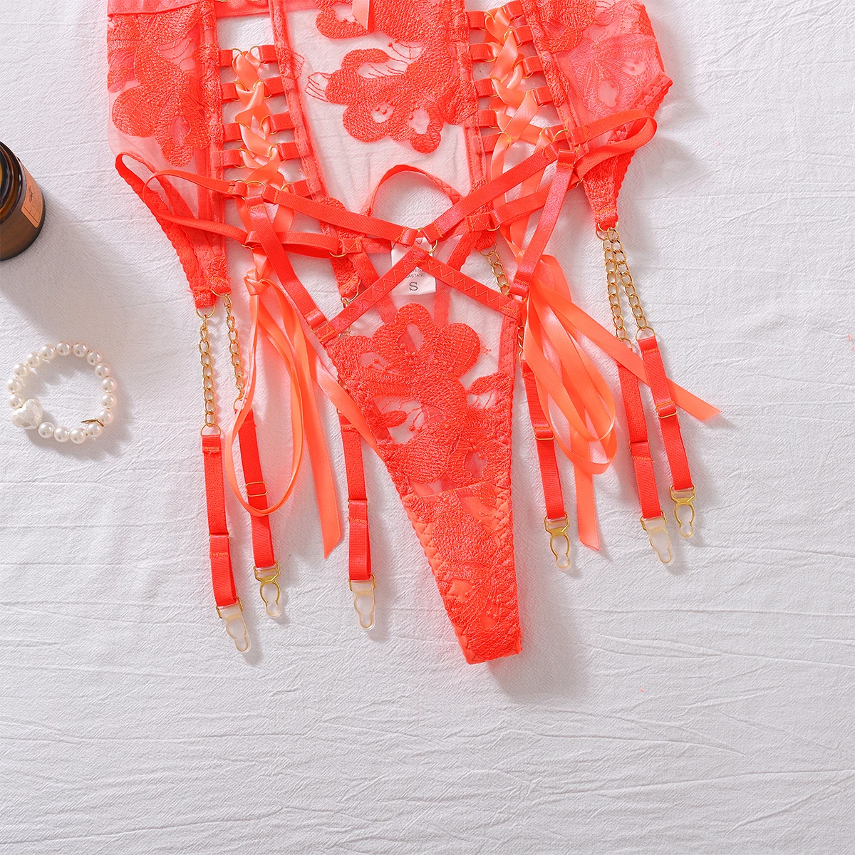 Ellolace Luxury Neon Orange Erotic Lingerie Transparent Ensemble Underwear g-String Thongs Fantasy Attractive Chest Suspenders