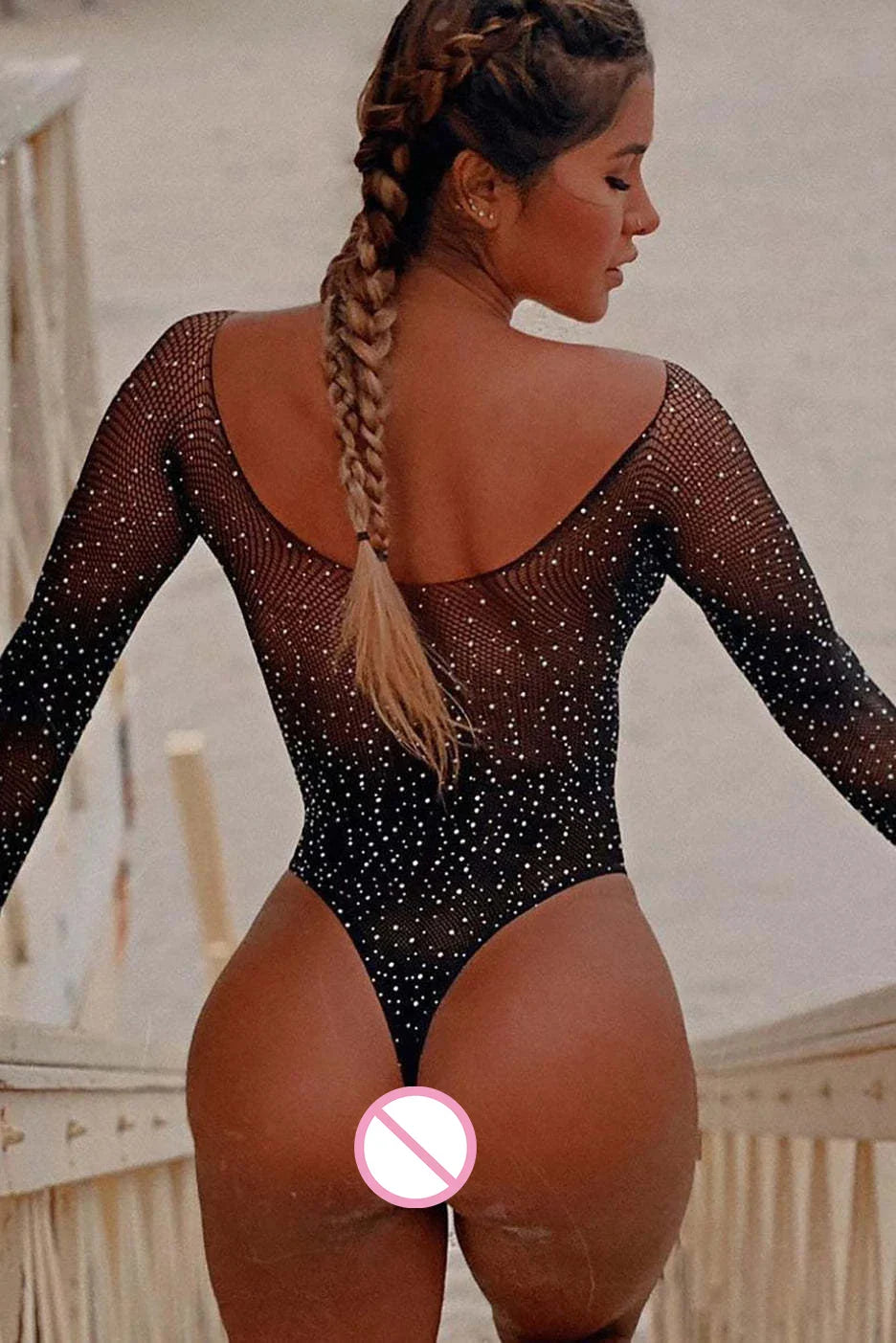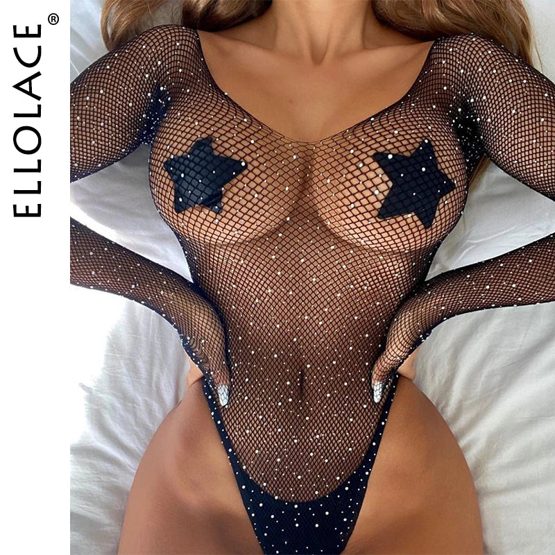 Ellolace Off Shoulder Fishnet Bodystocking Sexy Transparent Glitter Long Sleeve Bodysuit See Through Exotic Costumes Porn Tights