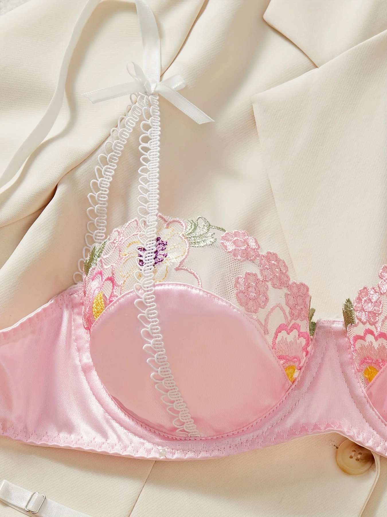 Ellolace Pink Lace Lingerie Sweet Girl Slip Underwear Silk Delicate Embroidery Bilizna Set Sissy Translucent Tulle Intimate