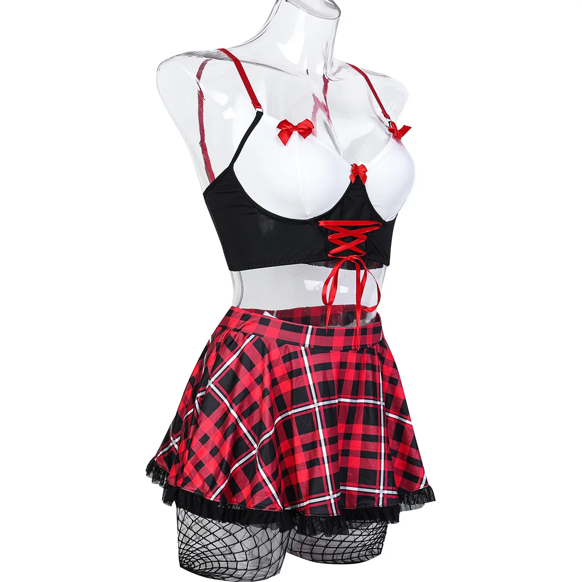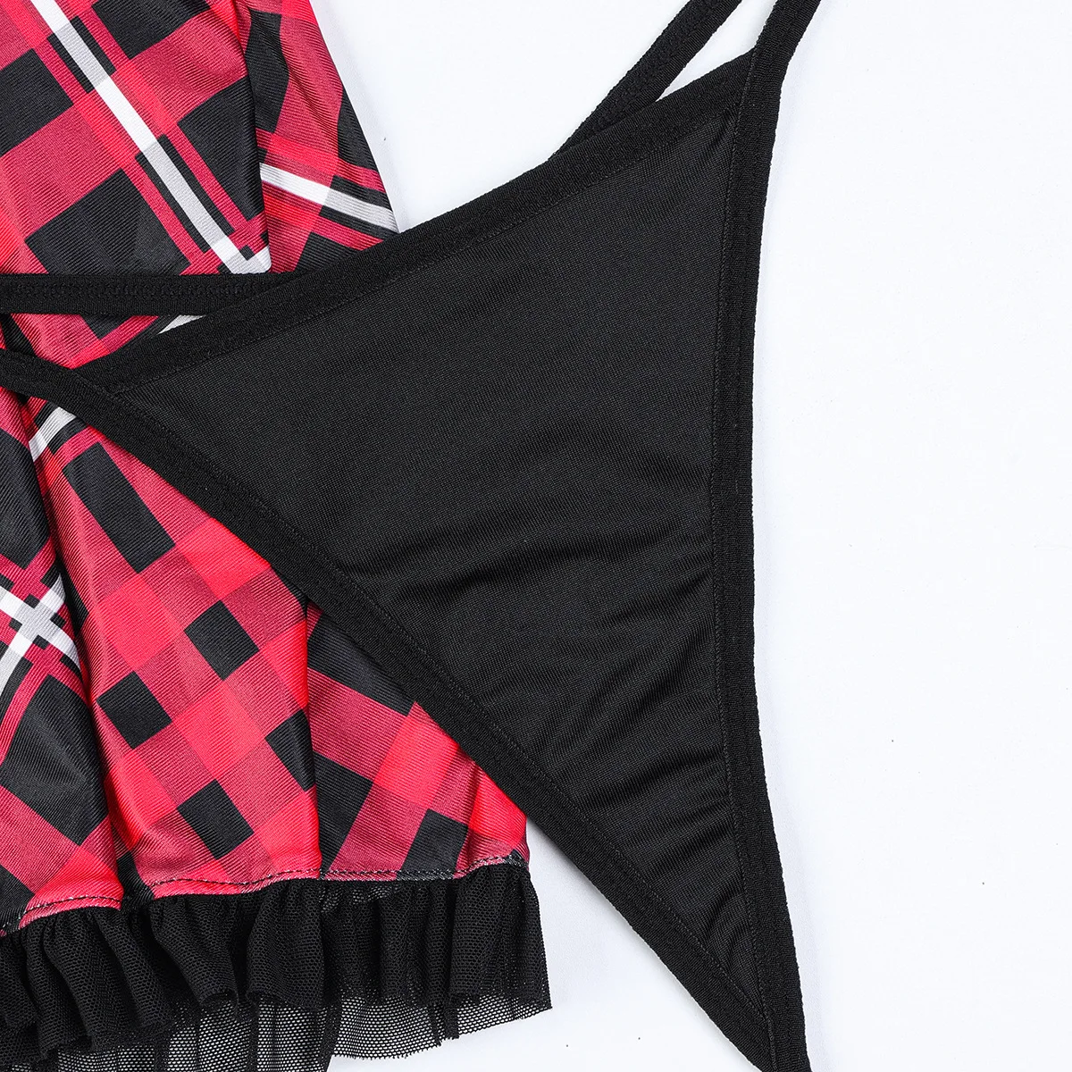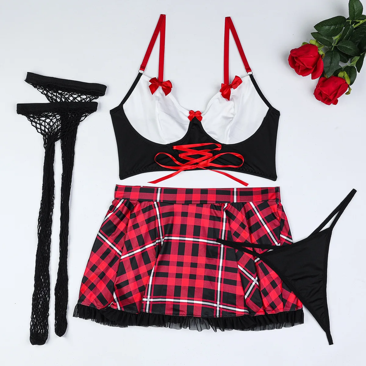 Ellolace Plaid Cosplay Sexy Lingеrie Set With Stocking Sissy Onlyfans Costume School Uniform Ensemble Lingeries Femmes 5-Piece