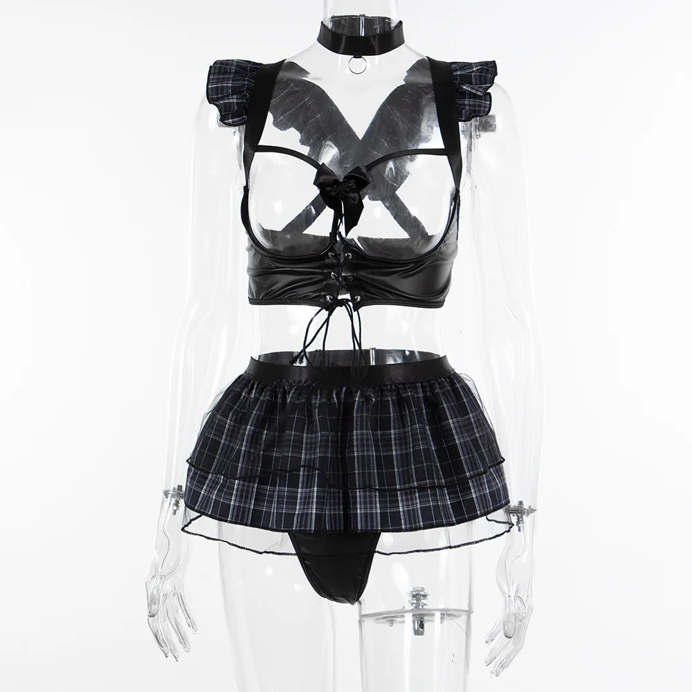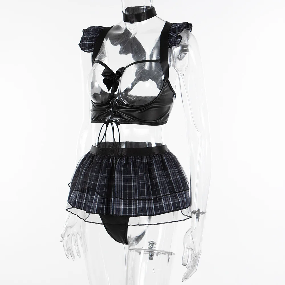 Ellolace Plaid Porn Sexy Lingerie Layered Skirt Cosplay Sexy Peekaboo Bra Sets Latex Lace Up Sissy Costumes Seductive Underwear