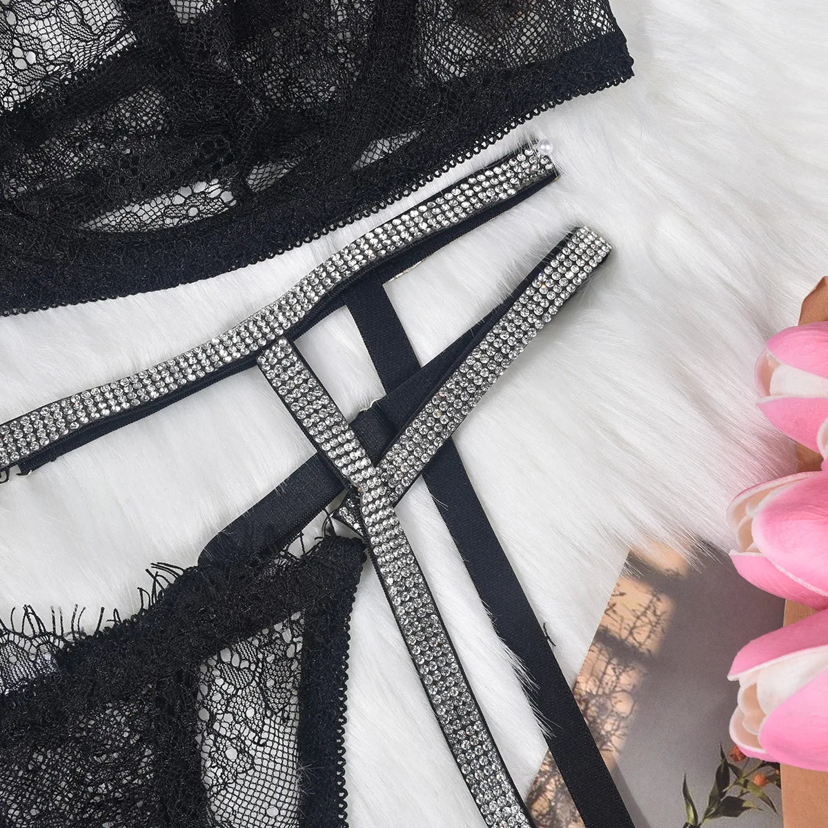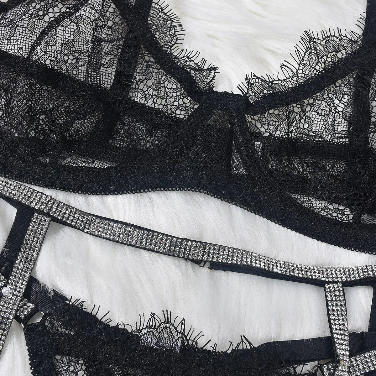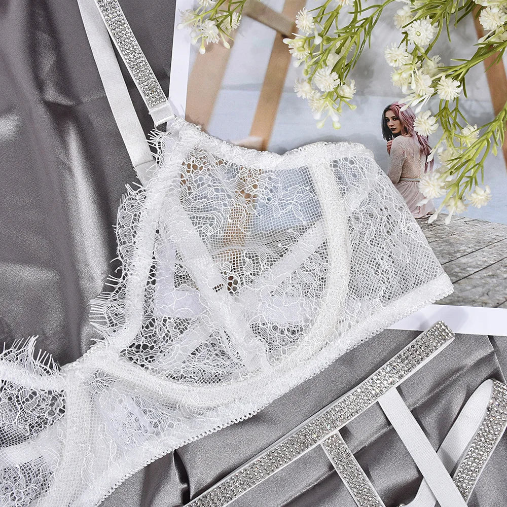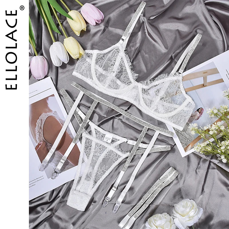 Ellolace Rhinestone Lingerie Sheer Lace Seamless Bra Kit Push Up Sissy Underwear Transparent Intimate Luxury Exotic Sets