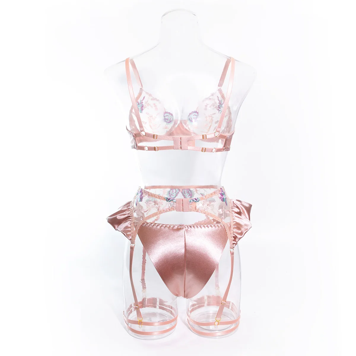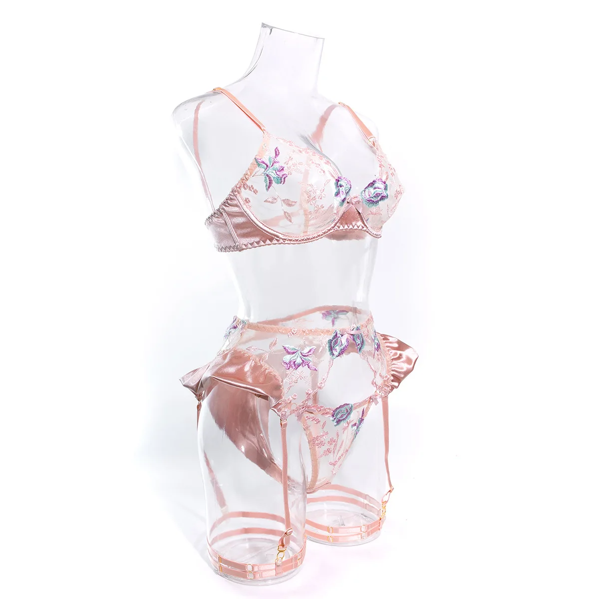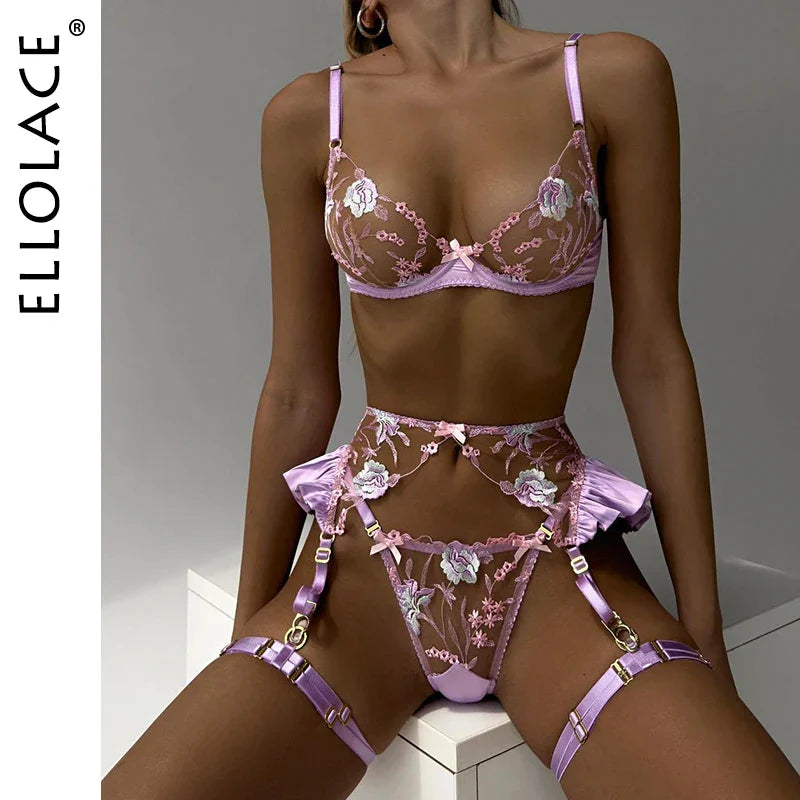 Ellolace Ruffle Erotic Lingerie Floral Intimate Set Transparent Lace Sexy Fantasy Underwear Luxury Attractive Pushup Bra Outfits