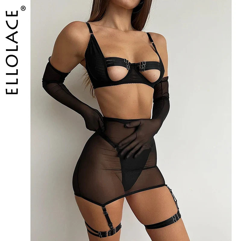 Ellolace Sensual Lingerie Cut Out Bra Garter Lace Up Bandage Sissy Underwear 4-Piece Exotic Sets Transparent Mesh Intimate