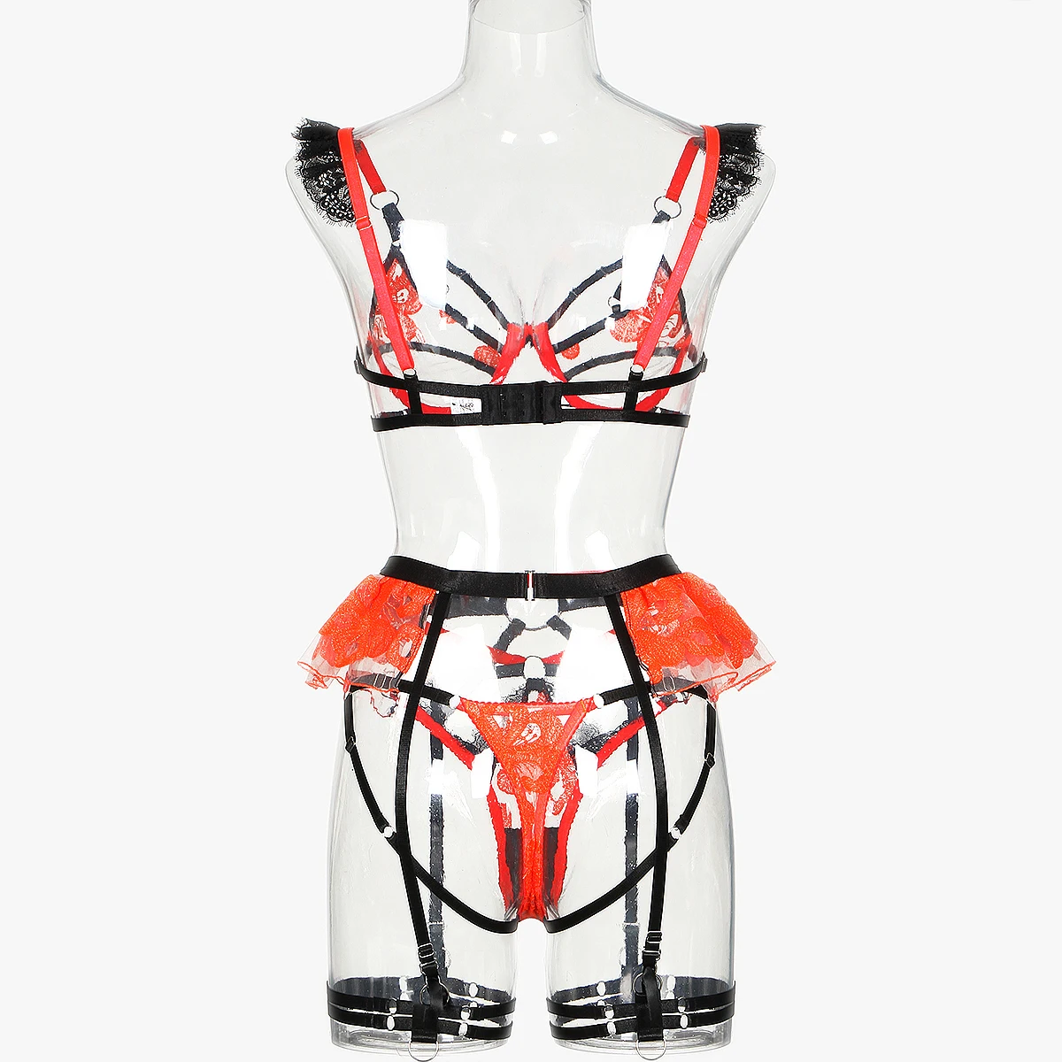 Ellolace Sexy Delicate Lingerie Lace Sissy Eritic Underwear 4-Piece Ruffle Garter Thongs See Through Bilizna Set Sensual Outfits
