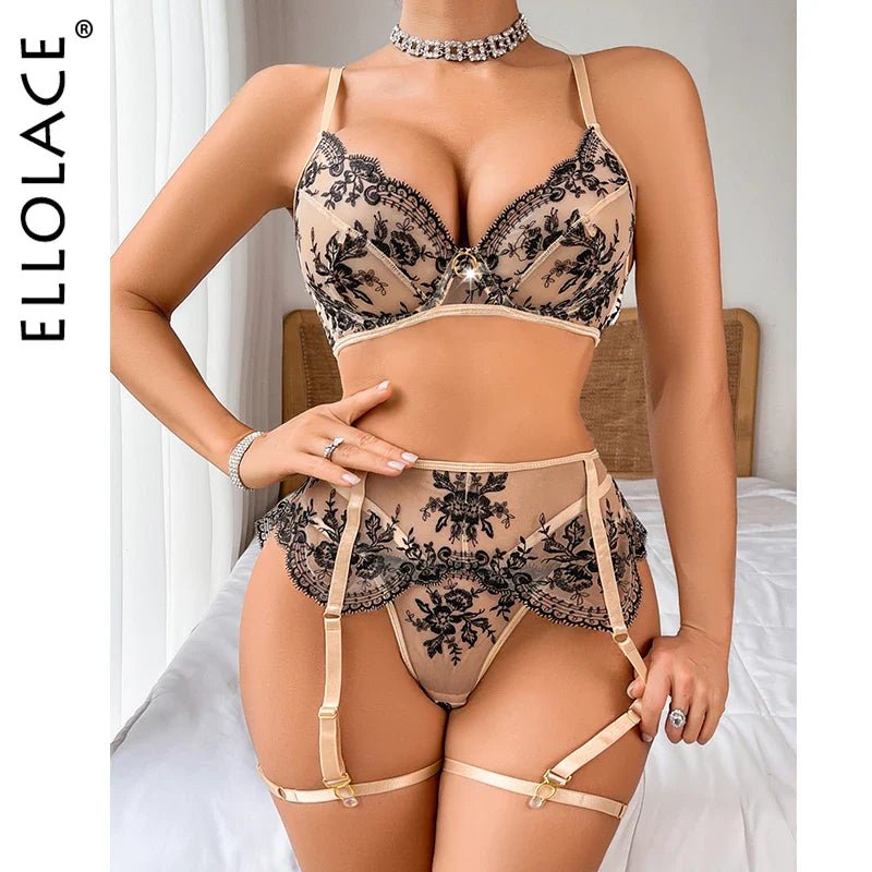 Ellolace Sexy Lingеrie Set Floral Attractive Chest Suspenders Bra Set Champagne Brazilian Underwear Fancy Hot Intimate
