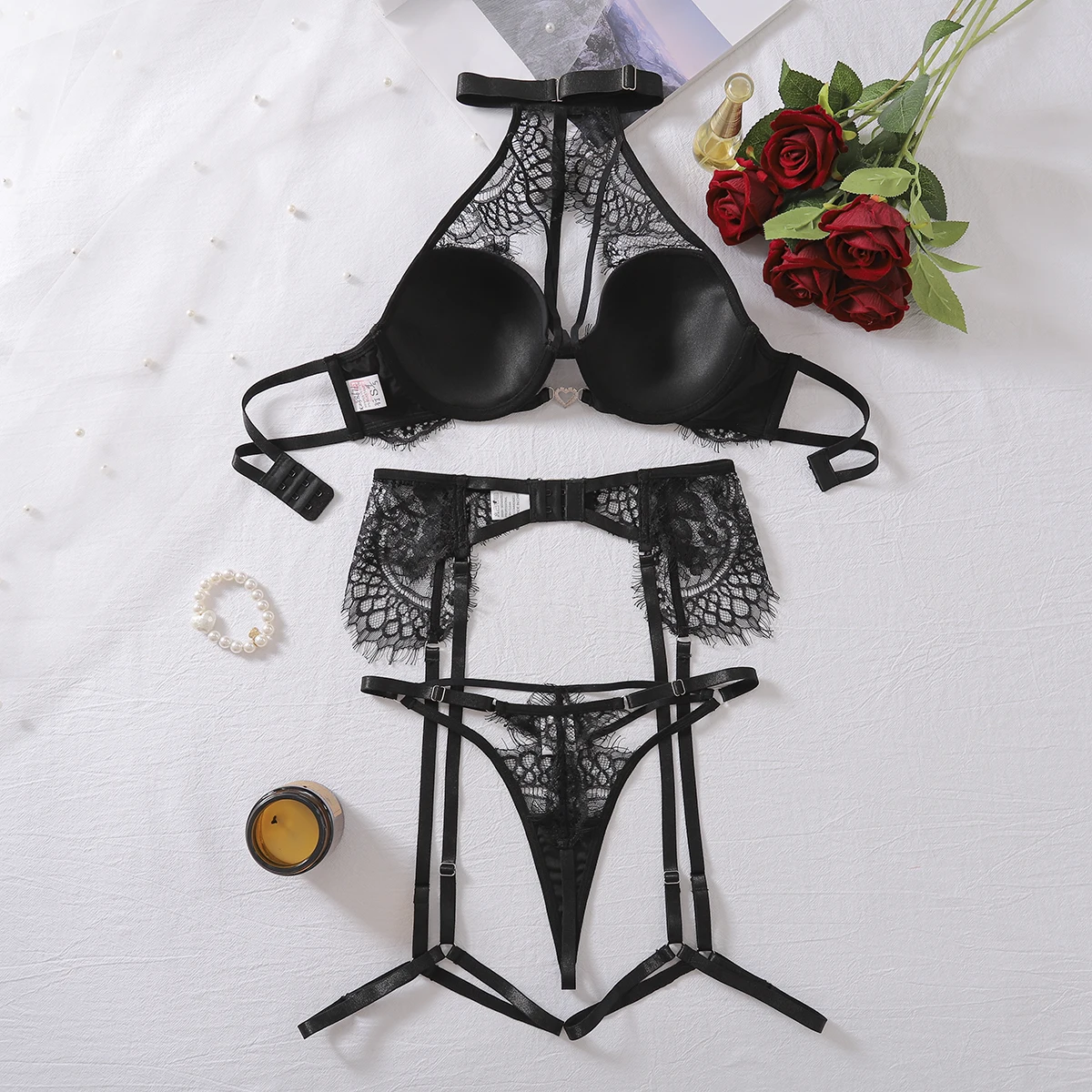 Ellolace Sexy Lingerie Halter Bra Onlyfans Kit Fantasy Bilizna Set Push Up Matching Garter Belt Set G-String Thong Intimate