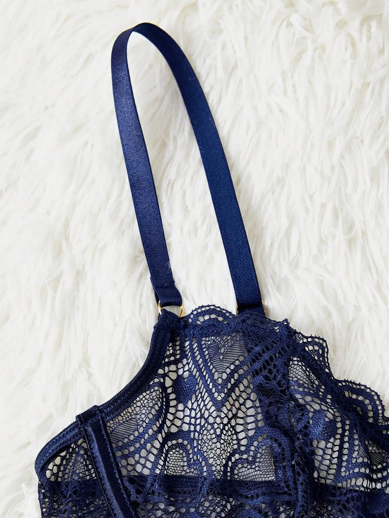 Ellolace Sexy Lingerie Lace Bodysuit Lace Up Hollow Out Teddy Bodysuit With Fishnet Stocking Navy Blue Love Fancy Onlyfans Body